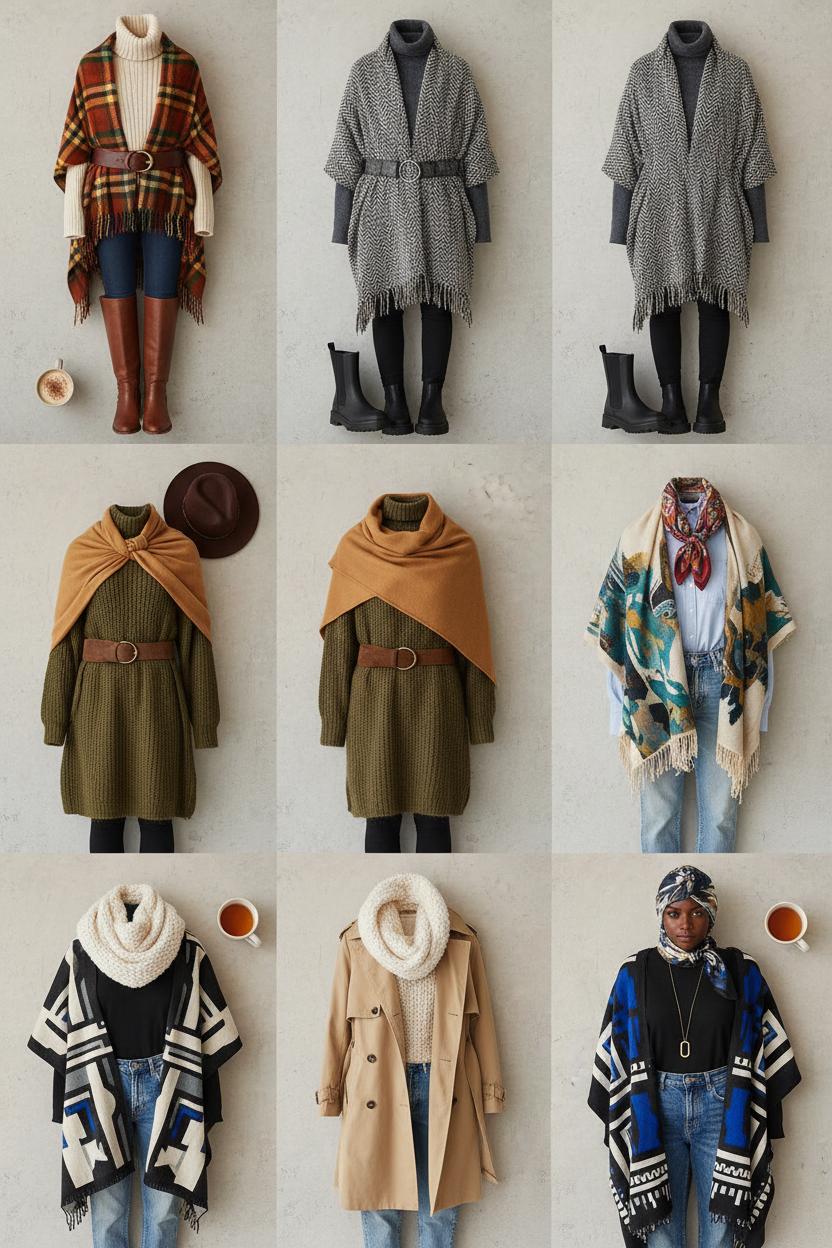 For fall outfit ideas that feel elevated but effortless, think texture-on-texture. A ribbed knit, skinny jeans, and knee boots look instantly street-style ready when you add a plaid blanket scarf cape and a leather belt. On casual days, drape it over a long-sleeve tee with leggings and lug-sole boots; the volume of the cape balances the sleek bottom. Over a sweater dress, choose a solid blanket scarf in camel or charcoal, then cinch with a suede belt and add a felt fedora for that pumpkin-patch-to-dinner transition. If you’re layering under a trench or leather jacket, keep the cape open and let the scarf peek out like a soft collar—one of those scarf styles that reads chic without trying.