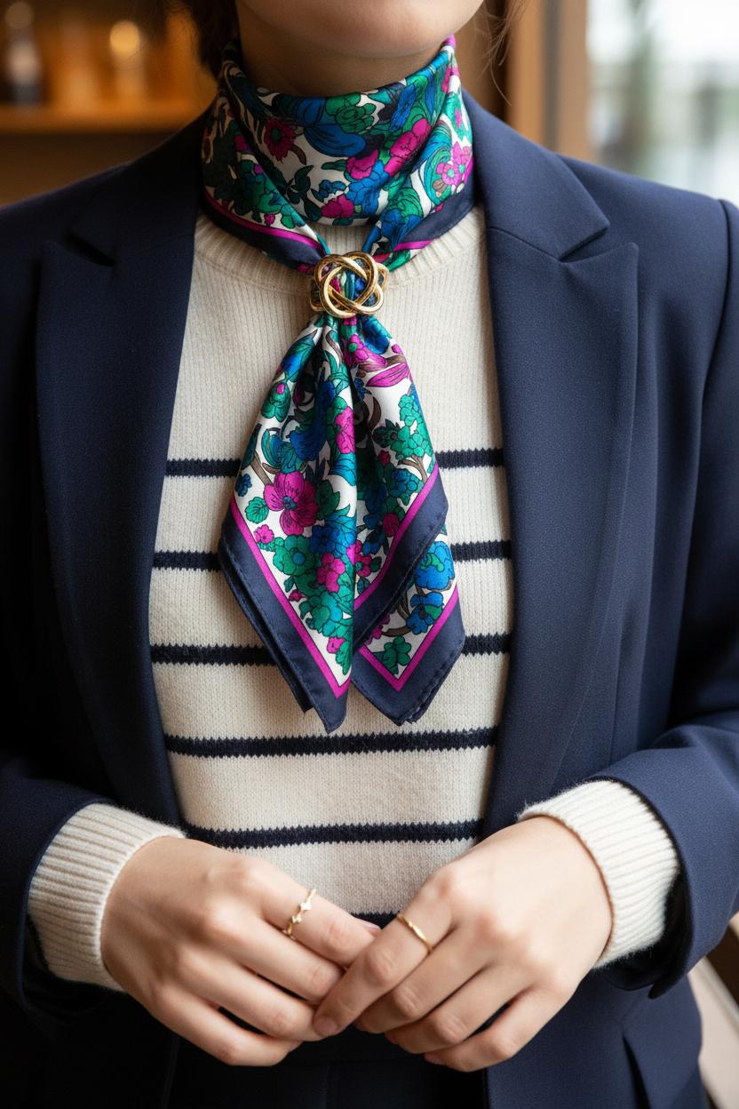 Styling is where the magic really lands. For daytime, pair your scarf-necklace with a crisp tee, straight jeans, and a trench—the ring catches the light and makes the whole look feel intentional. For desk-to-dinner, tuck a jewel-toned square scarf under a blazer and let the scarf ring sit at the hollow of your throat, like a modern cameo. Print-on-print? Absolutely: let a floral silk scarf peek out from a striped knit for that Pinterest-cool mix. However you spin it, this scarf ring trick is the answer to how to wear a scarf when you want maximum impact with minimum effort—one of those scarf styles that feels fresh, flattering, and endlessly remixable.