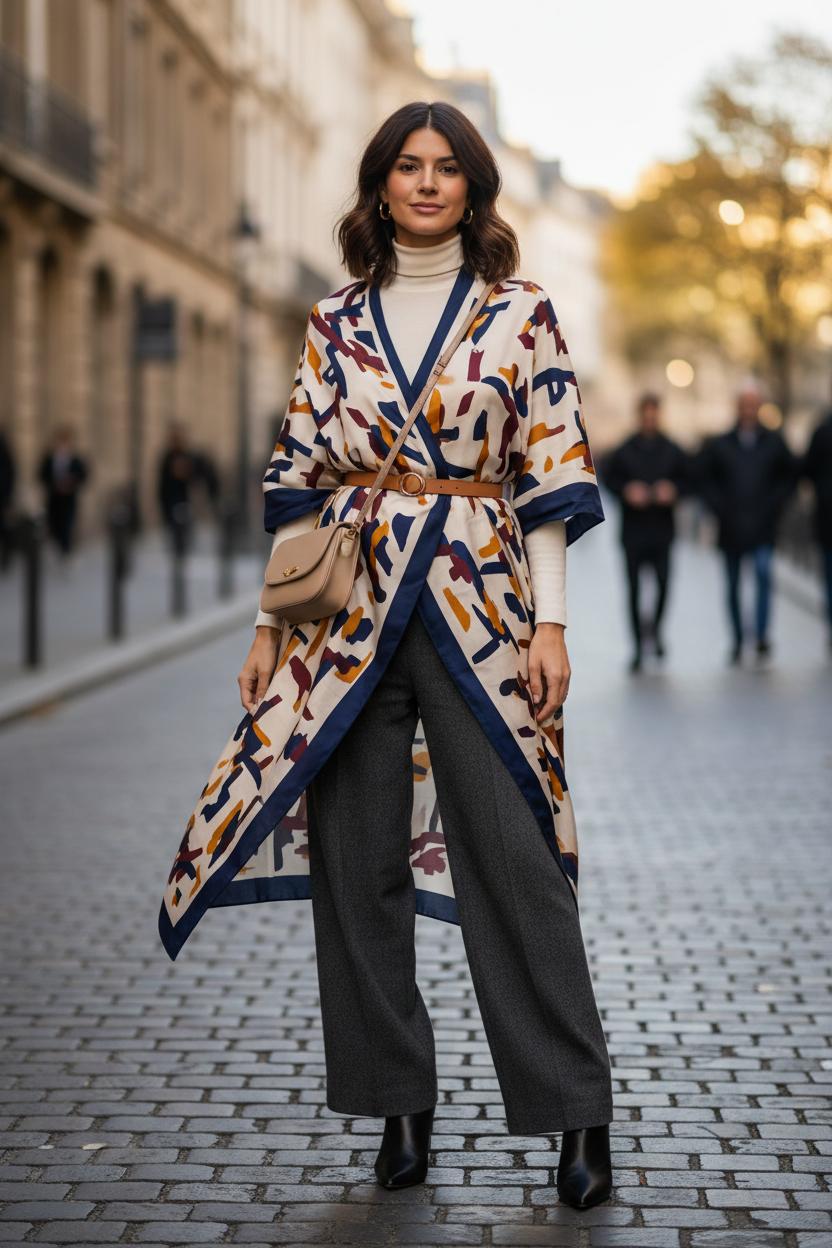 Think of the belted kimono wrap as the easiest way to turn a simple square scarf into a waist-defining layer that instantly elevates basics. It’s equal parts cozy and chic—one of those scarf styles that looks like you really tried, even when you didn’t. For a lightweight, drapey effect, reach for a silk scarf; for extra warmth, a blanket scarf works beautifully and creates more dramatic volume. This look solves the “how to wear a scarf” question when you want movement, coverage, and shape all at once—perfect over tees and wide-leg trousers, a slip dress, or a turtleneck and jeans for effortless fall outfit ideas.