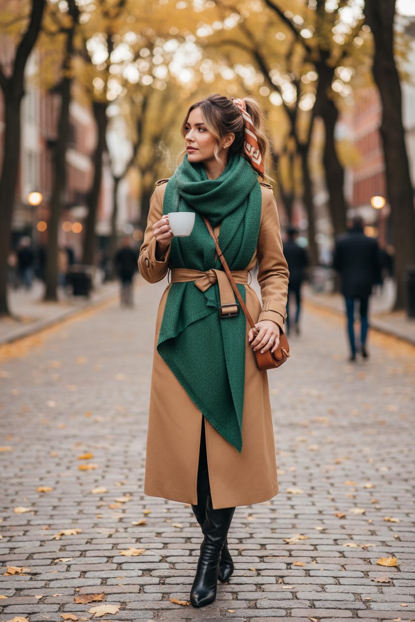 For scarf tying that stays put all day, you can also feed the scarf ends through a scarf ring before tucking them into the belt; it creates a sleek focal point at the center and keeps volume controlled. Petite? Keep the triangle shallower and knot the ends before belting so the fabric doesn’t overwhelm you. Taller or craving drama? Let the point hang lower and keep the ends looser for movement. A camel trench with a forest-green blanket scarf reads classic; a black trench with a check pattern leans edgy; a cream trench with a rust tone feels pumpkin-patch chic. Finish with ankle boots and a crossbody, and you’ve got a commuter-to-cocktails uniform that’s photo-ready from every angle.
