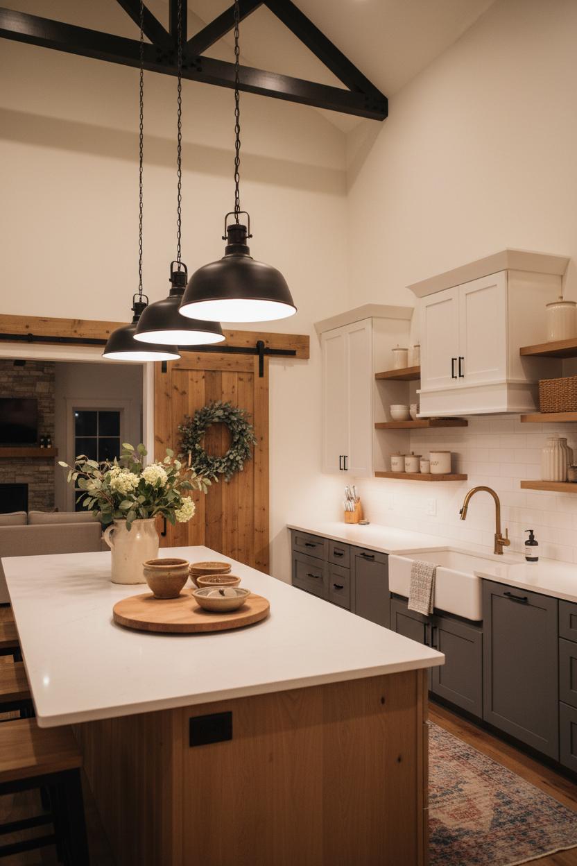 Styling keeps it lived-in and lovable. Line open shelves with everyday farmhouse decor—cream pitchers, ribbed glass canisters, and woven baskets—so storage doubles as display. Tuck a vintage rug runner between range and island for softness underfoot, and add leafy stems in a handled crock for a fresh, unfussy centerpiece. Repeat the industrial pendant light in pairs or a trio to pull the eye down the length of the island, then dim them at dusk for that cozy, candlelit glow. With smart selections and a few high-impact swaps, your kitchen becomes the best kind of modern farmhouse: soulful, streamlined, and ready for late-night snacks, early-morning lattes, and every messy, memory-making moment in between.