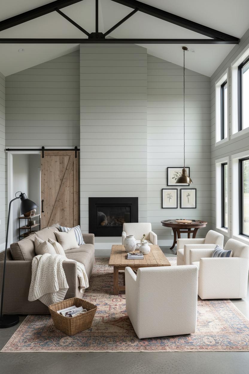 Because barndo floor plans are open by nature, use your layers to define zones. Angle the sofa and two cozy chairs around a stove or media wall, tuck a slim console along the shiplap wallpaper accent, and anchor everything with a generous rug so conversation feels intimate, not adrift. If you’re still sketching barndominium house plans, think about sightlines: where will that accent wall greet you, and how will traffic slip behind seating with no stumbles? A consistent palette—creamy whites, warm woods, inky black, and a pinch of brass—threads modern farmhouse warmth from entry to sofa corner. The result is a living room that feels gathered over time, equal parts relaxed and refined, and perfectly tuned to your favorite barndominium ideas.