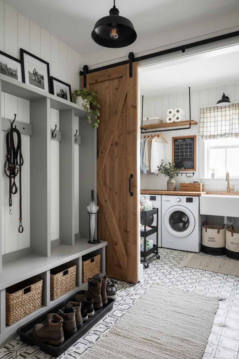 If you want everyday life to feel effortless, start by leveling up the mudroom-laundry duo. In many barndo floor plans, this zone becomes the home’s real front door—where boots land, backpacks get corralled, and laundry never has a chance to pile up. Think built-in cubbies with a deep bench, tall lockers for coats, and a drip-friendly boot tray right by the threshold. A sliding entry with barn door decor keeps the mess contained without stealing floor space; choose chunky barn door hardware in matte black for a sturdy, graphic line that plays beautifully with a modern farmhouse palette. For instant texture, line the walls with shiplap wallpaper—way faster than the real deal but just as charming. Anchor the space with brick or patterned porcelain tile, then warm it up with woven baskets, brass hooks, and a nubby indoor-outdoor runner. Finish with an industrial pendant light overhead so the drop zone glows even on gray days, and tuck a slim umbrella stand and dog-leash hook beside the bench for grab-and-go ease.