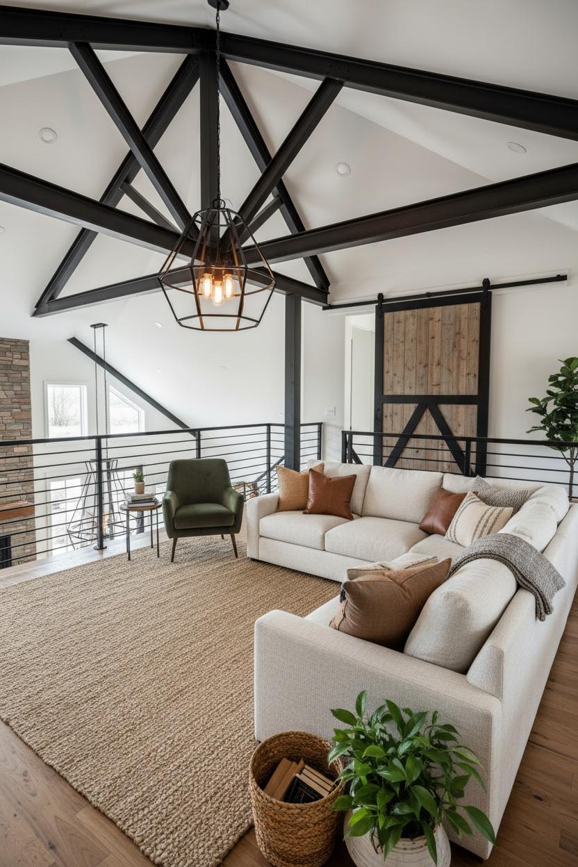 Then, bring in soul. A reclaimed wood coffee table paired with matte black accents lands you squarely in that rustic modern home sweet spot. Slide in barn door decor to soften wide openings—those weathered panels instantly add warmth and movement, and with clean-lined barn door hardware they read chic, not kitschy. Float an industrial pendant light over a reading corner or game table to pool a gentle glow, then repeat the metal finish in a floor lamp or picture frames for a quiet rhythm. Layer in farmhouse decor through woven baskets, botanical art, and a few pottery pieces with honest, chalky textures; keep surfaces edited so the architecture can breathe, but let everyday things feel collected and lived in.
