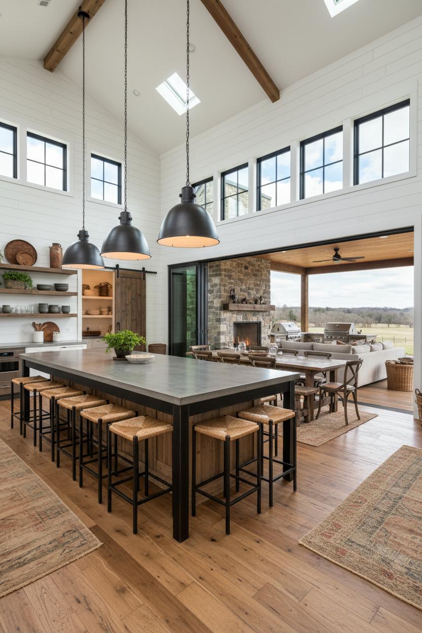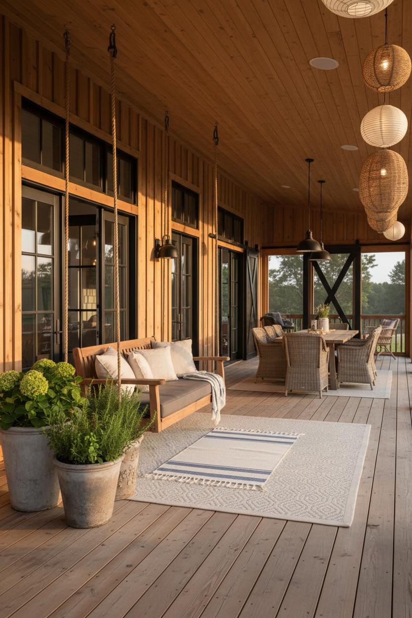 If you’re dreaming up outdoor spaces that feel like an extension of your great room, start by letting your porch and patio echo the textures and tones of your interior modern farmhouse palette. Think warm woods, matte black metals, and creamy neutrals that flow right through a set of French doors or a wide sliding entry—bonus points if you lean into barn door decor with weather-friendly barn door hardware on a screened porch. In your barndo floor plans, sketch generous covered porches that wrap the main living areas, then add a deep swing, layered outdoor rugs, and chunky planters for herbs and hydrangeas. A pair of industrial pendant light fixtures over a farmhouse table turns a simple covered patio into an evening dining nook, while woven lanterns and soft, linen-look cushions keep the vibe relaxed. If your interior uses shiplap wallpaper for texture, mirror that rhythm outside with vertical cedar cladding or painted lap siding so the whole place reads as one cohesive, rustic modern home.
