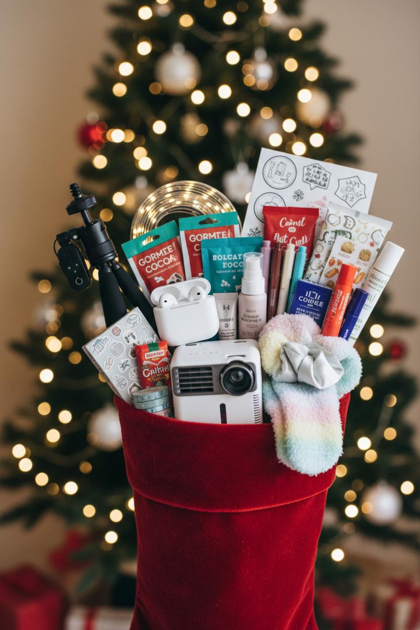 When it comes to stocking stuffers, think small but mighty—little surprises that feel fun, practical, and trendy all at once. For tech-loving teens, tuck in wireless earbuds for the bus ride soundtrack, plus a compact phone stand or cute phone charm to personalize their everyday carry. A roll of LED strip lights is an instant room glow-up and slips easily into a stocking; they’ll love setting the vibe for study sessions or TikTok dances. If you’re planning bigger tech gifts under the tree, use the stocking to round them out: a few packs of film for a polaroid instant camera, a mini tripod, or a tiny Bluetooth remote for hands-free selfies. You can even add a note promising a cozy movie night with a mini projector—pair it with popcorn packets and hot cocoa mix for a themed surprise. These clever add-ons are the kind of teen gift ideas that feel thoughtful and totally usable long after the wrapping paper is gone.