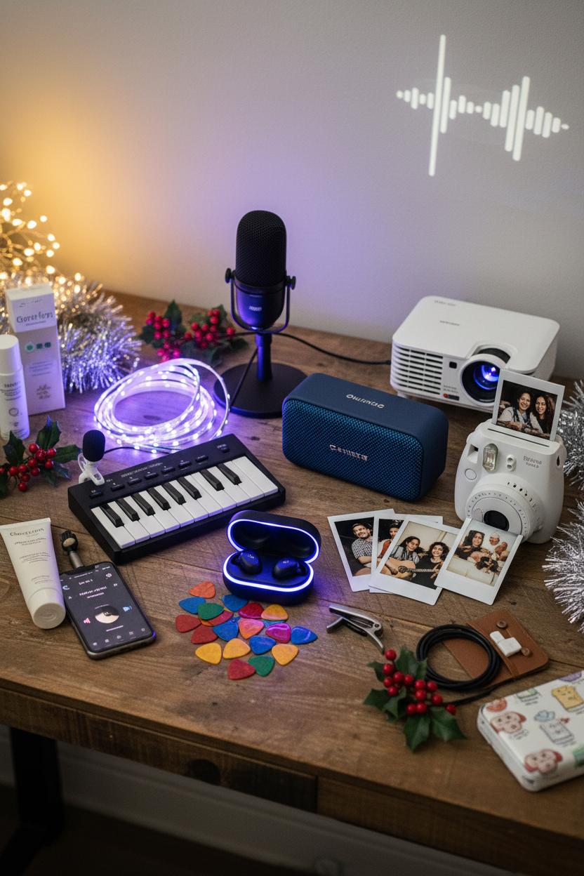 For the budding creator, make it immersive. A mini projector turns blank walls into a backdrop for lyric videos, concert films, or moody visualizers during jam sessions, and a polaroid instant camera is a nostalgic way to capture band practice, first gigs, and friendship moments taped around the mirror for instant inspo. Round things out with practical little stocking stuffers: colorful guitar picks, a capo, cable organizers, or a phone-friendly mic for crisp TikTok covers. Even a gentle skincare set fits the vibe—post-rehearsal self-care that says “I see your hustle.” Don’t forget memory cards, an extra charger, or a cute case to keep gear safe on the go. Whether you’re pulling together teen gift ideas for a casual listener or a future headliner, think pieces that help them hear better, create easier, and express their aesthetic. The result is a personalized mix of tech and touches that make them feel seen—and that’s the secret to holiday gifts teens actually love.