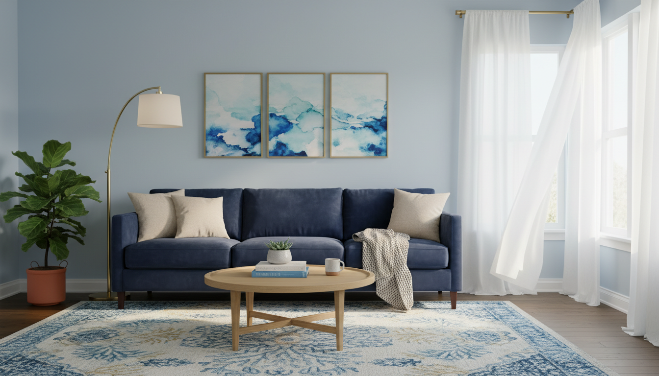 Dreaming of a blue living room that feels cozy, modern, and coastal? This guide spills chic blue paint ideas, smart living room styling tips, and effortless navy sofa decor to refresh your space. From a plush navy velvet sofa paired with a textured blue area rug to a warm brass floor lamp and light wood coffee table, we’ll show you how to layer color, metal, and natural tones for a breezy coastal modern living room. Plus, elevate your walls with calming coastal wall art. Get inspired to mix shades of blue for a room that’s serene, stylish, and totally you.