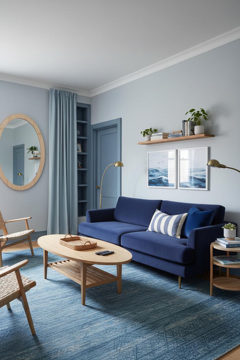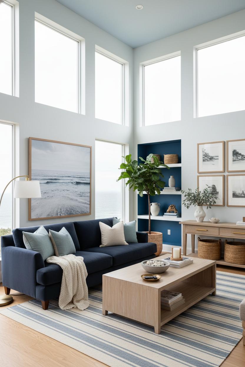 Think vertical and breezy to nail that coastal modern living room vibe. Float shallow shelves or a picture ledge for books and plants, and hang coastal wall art in a simple grid to draw the eye up. Open-frame accent chairs and a glass or woven tray keep things light, while a few natural textures—jute, rattan, linen—play beautifully with blues. In living room styling, repeat your blues in three places (sofa, rug, art) and sprinkle warm metals and pale woods throughout for balance. With smart scaling, layered lighting, and mindful color, even the tiniest blue retreat can look pulled-together, welcoming, and wonderfully spacious.