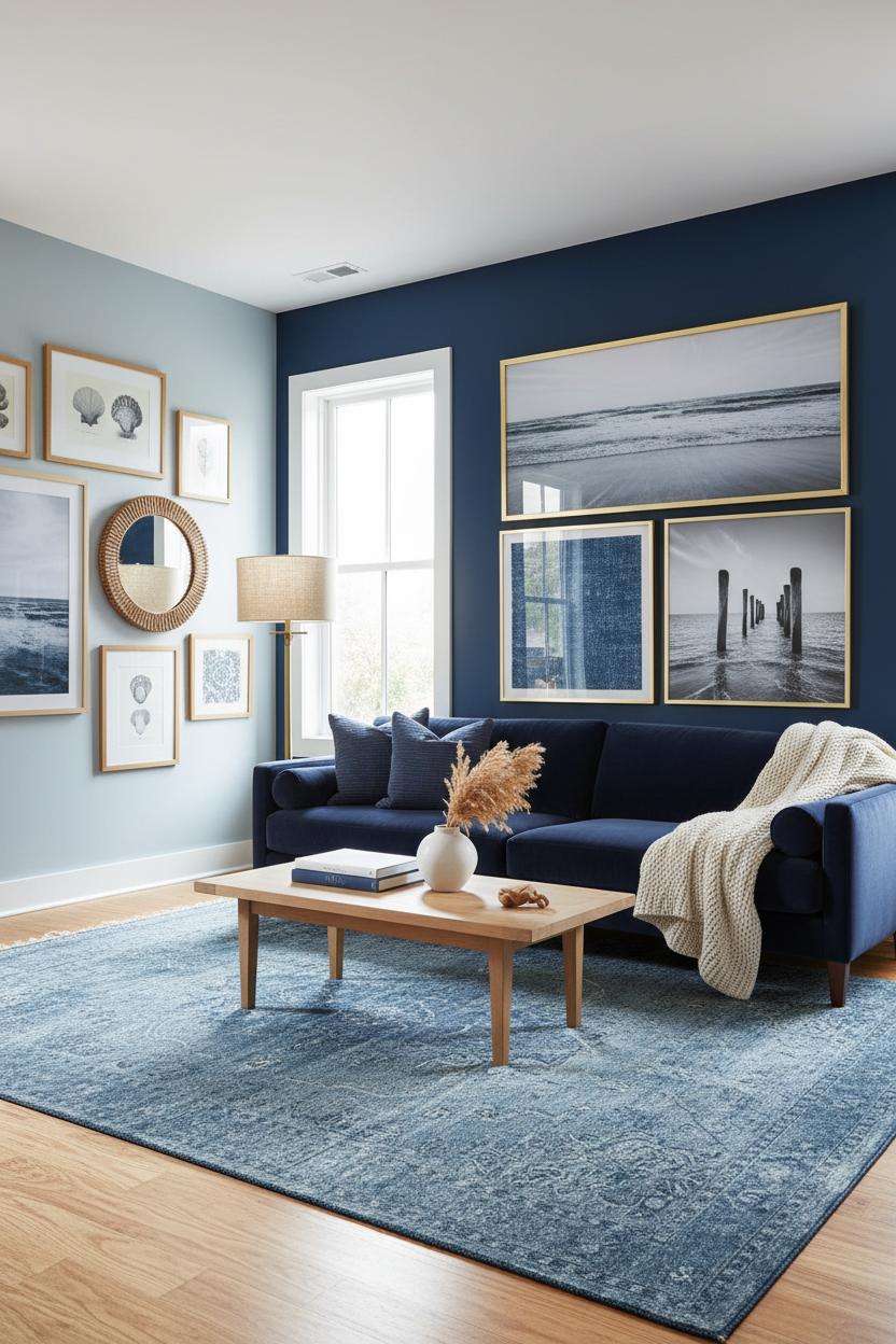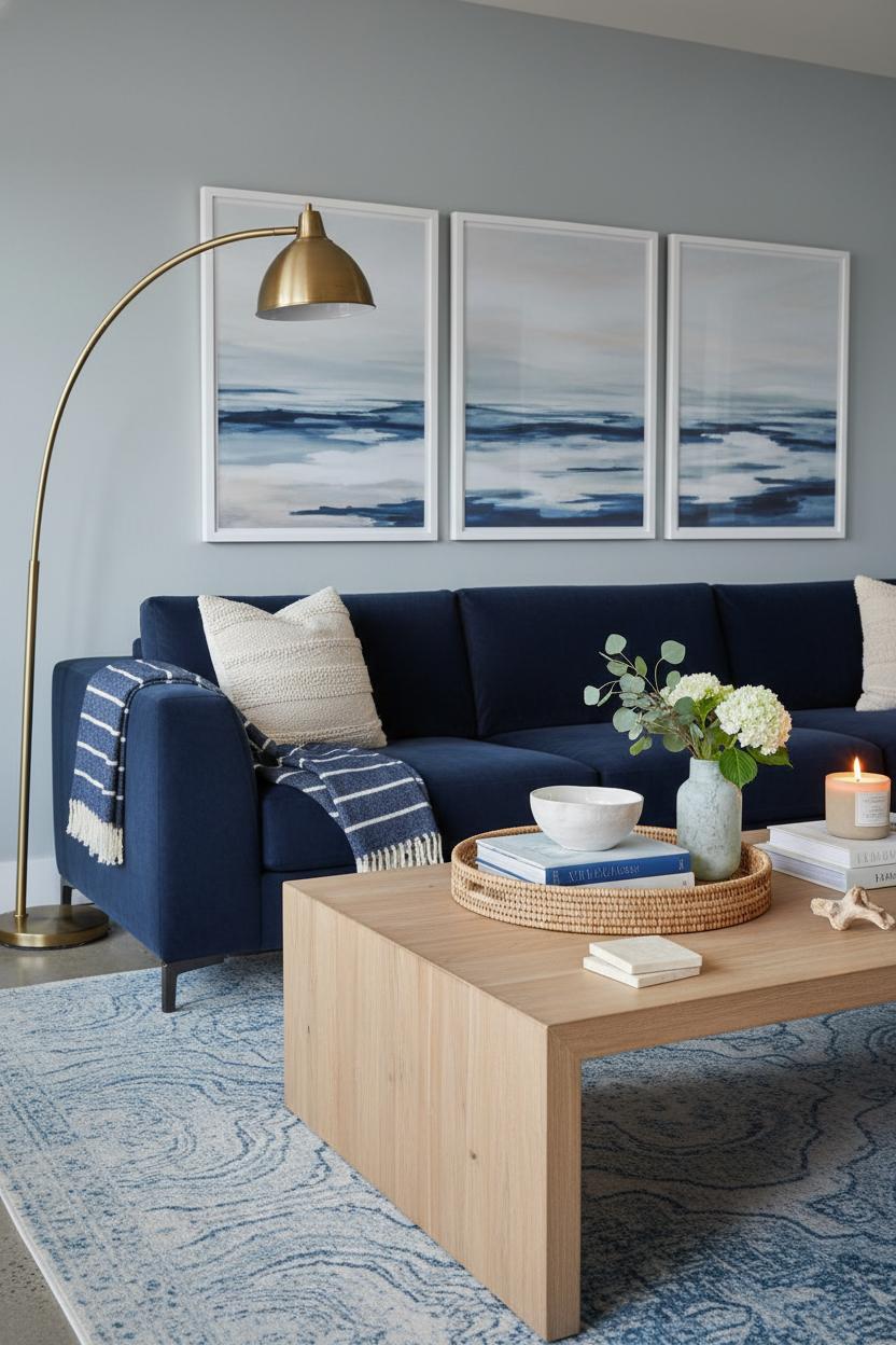Tie the look to the furniture story so your living room styling feels intentional from ceiling to floor. A navy velvet sofa sets a luxe anchor; layer in navy sofa decor with tonal pillows and a nubby throw that nods to surf and sand. Underfoot, a blue area rug whispers color continuity, while a light wood coffee table echoes your frames and keeps everything airy. Aim for scale that soothes: art that’s roughly two-thirds the width of the sofa, hung so the center sits near eye level. Leave negative space around each piece like whitecaps between waves, and repeat hues—navy, sky, sand, a glint of brass—so every wall moment speaks the same language. The result is easy, ocean-kissed elegance that feels modern, cozy, and wonderfully you.