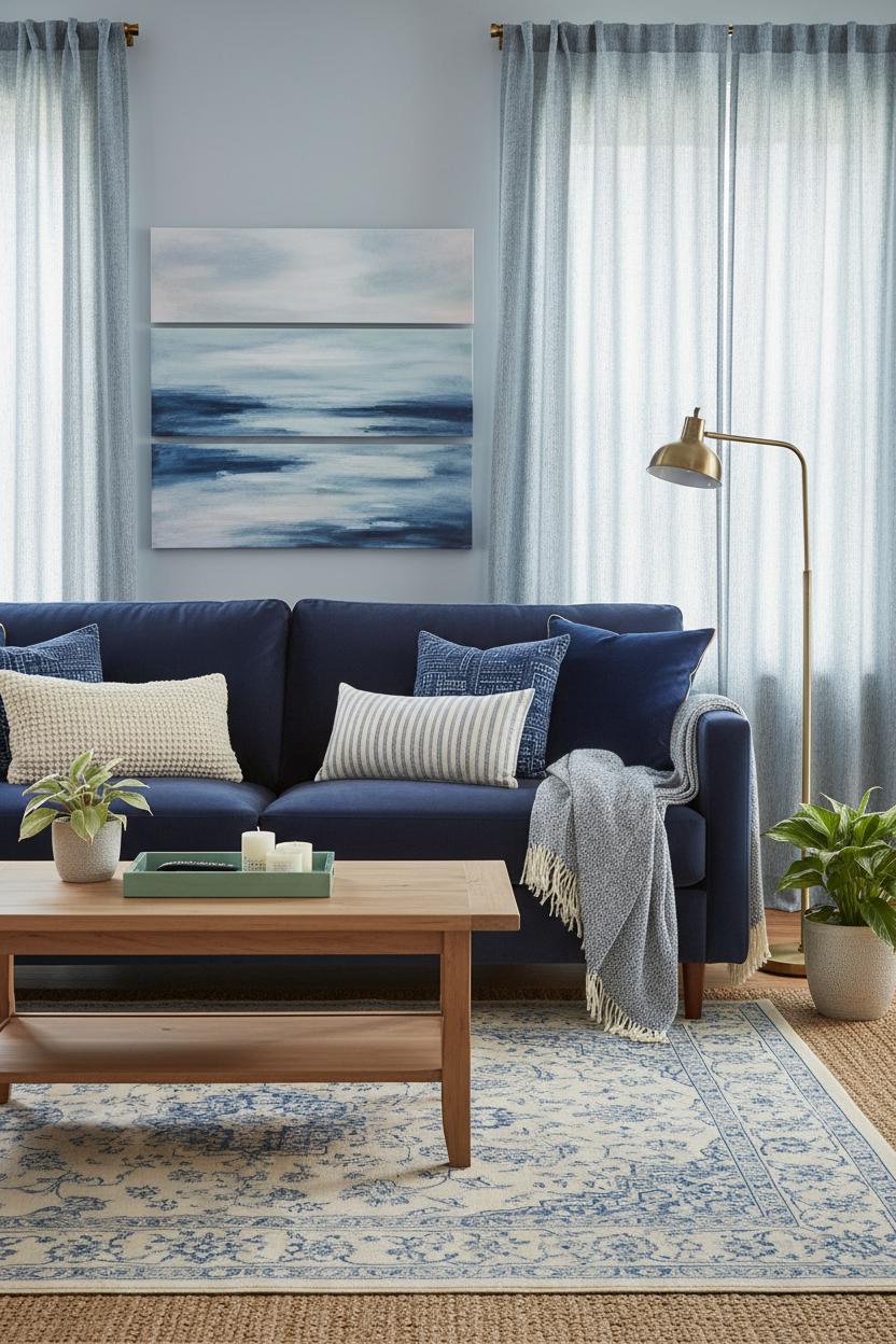 Drapery seals the deal. Airy linen panels in soft white or chambray let light dance while echoing your palette; if your walls lean warm, choose curtains with a creamy undertone, and if you followed cooler blue paint ideas, pull a cooler gray-blue. For drama, take velvet panels to the floor in a deeper navy and let them pool an inch or two. On the ground, a blue area rug grounds the space—try a low-contrast vintage-inspired pattern layered over a jute base for depth without visual noise. Then sprinkle in materials that make the blues sing: a light wood coffee table to warm things up, a brass floor lamp for that golden-hour glow, and a ceramic tray with a subtle coastal glaze to corrall remotes and candles.