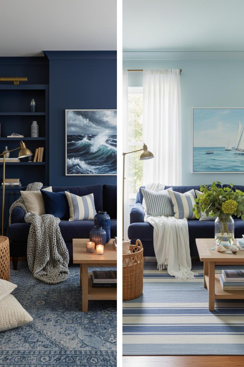 If you’re dreaming up a blue living room that feels equal parts cozy, modern, and coastal, start by choosing your foundation and build from there. For blue paint ideas, think soft foggy blues on the walls to brighten the space, or keep the walls a crisp white and go deep on an accent like a built-in or fireplace in inky navy; either route gives that ocean-kissed backdrop without feeling theme-y. Anchor the room with a navy velvet sofa and lean into layered navy sofa decor—mix textured pillows in indigo, slate, and a subtle ticking stripe, then drape a chunky knit throw over the arm for an instant “come sit” moment. Underfoot, a blue area rug—vintage-inspired with a slightly faded pattern or a tonal geometric—grounds the seating and brings all the blues together. Choose a size that lets at least the front legs of your furniture sit on the rug so the room reads intentional and not floaty.