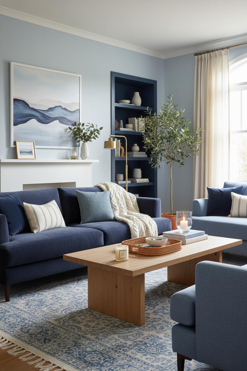 Finish your living room styling with greenery (an olive tree or eucalyptus stems are effortless), a stack of design books, and a candle that smells like salt air. Keep your palette to three blues max and sprinkle them around the room for cohesion—pillows, rug, art, even a navy stripe on a throw. If you need extra seating, swap in a performance-fabric sectional in a mid-blue and paint the back of a bookcase in navy to tie it together. The result: a collected, calm blue living room that feels like morning light on the water, ready for coffee, conversation, and every cozy night in.