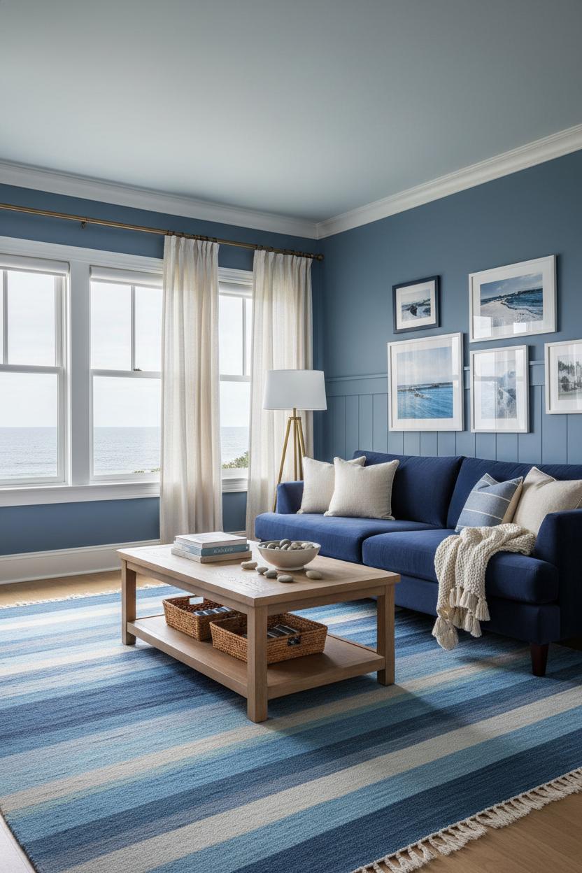 When it comes to blue paint ideas, keep the vibe breezy and modern. Try a whisper-soft blue-gray for the walls, pair a bright white backdrop with a pale blue ceiling, or paint the interior of built-ins a deeper coastal blue for depth without crowding the room. A blue area rug underfoot instantly defines the seating zone, especially in open layouts; choose a flatweave with subtle stripes or a vintage-inspired pattern that feels collected over time. For art, skip the clichés and curate coastal wall art that reads elevated—abstract seascapes, vintage coastline sketches, or washed-out photographic prints in natural wood frames. An oversized piece above the sofa or a balanced grid along a focal wall keeps the look clean and chic. Layer in warm metal moments—like a slender brass floor lamp beside the sofa or brass pulls on a console—to bring a hint of glow that plays beautifully with organic textures.