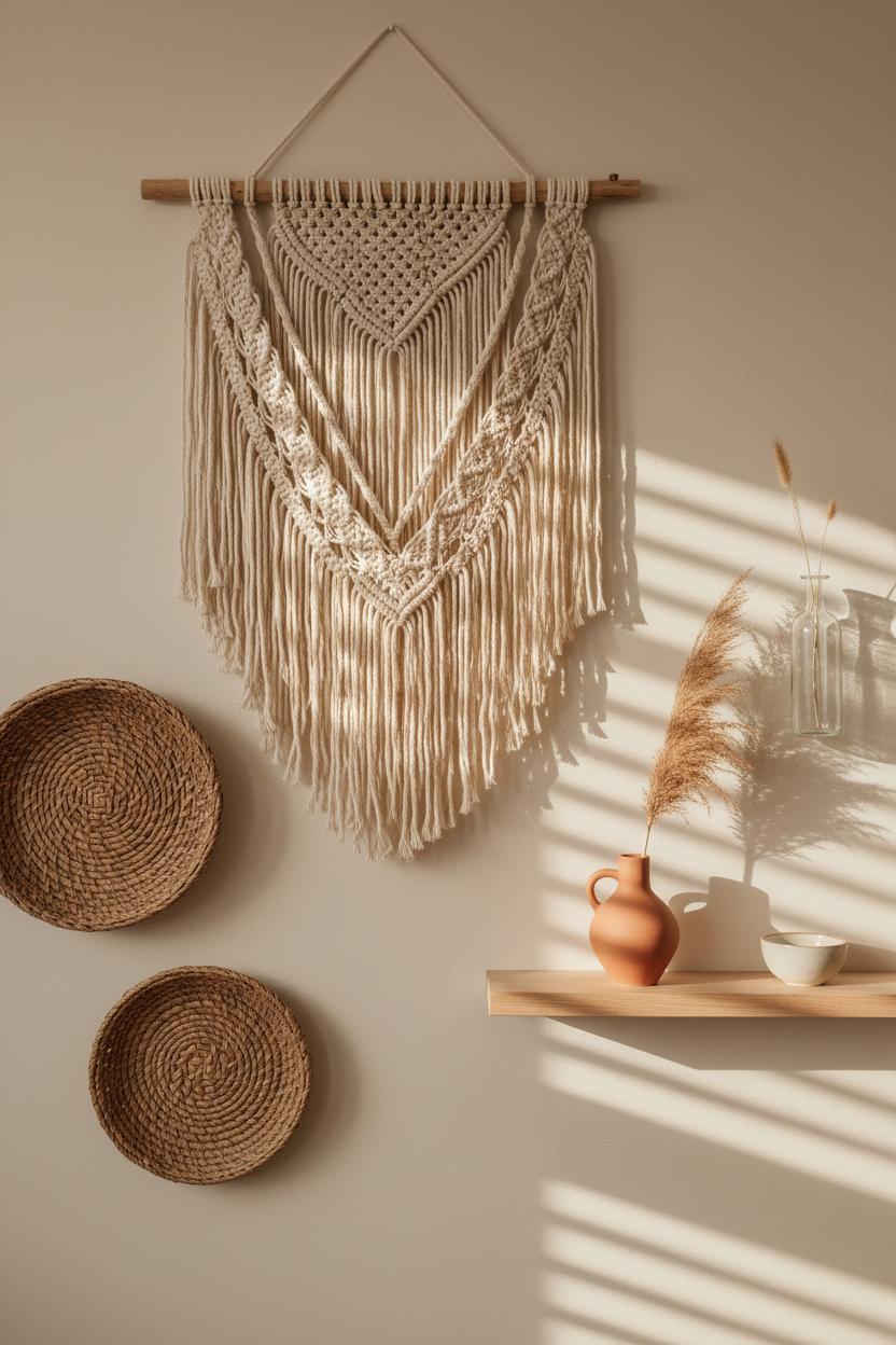 Let your walls breathe with texture and calm, the kind that turns blank space into a soft conversation. Start with a macrame wall hanging as your anchor—its knots add movement and shadow without feeling heavy—and build out from there with textural art in a warm, tonal palette. Think linen banners, handwoven baskets, carved wood panels, and a slender shelf for a petite ceramic or two; even a slim stem of pampas grass decor in a wall vase can bring that floaty, boheme aesthetic you love. Keep the arrangement airy by mixing sizes and leaving generous negative space so each piece can glow in the afternoon light. The effect is a gentle layering that feels collected over time and instantly adds boho decor ideas to any corner, from entryway to sunlit nook.