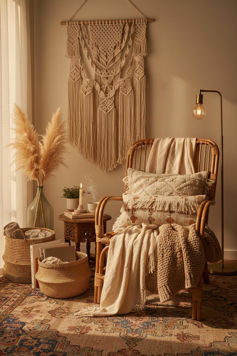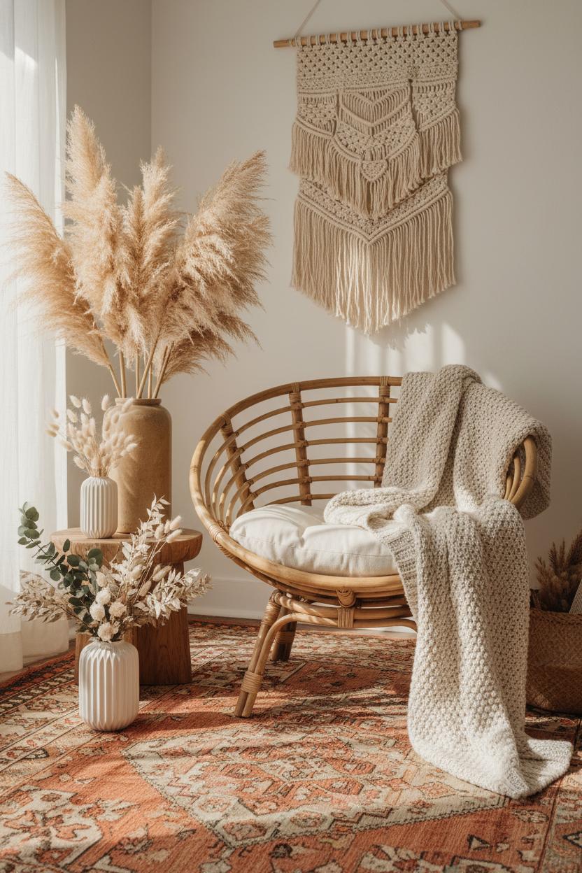 Anchor the vignette with a vintage persian rug underfoot to bring in history and pattern, then frame the chair with organic elements. A tall vase filled with pampas grass decor softens the edges and introduces movement, while a macrame wall hanging behind the chair draws the eye up and adds sculptural interest. Keep a petite side table within reach for tea and a flickering candle, and tuck a pair of woven storage baskets nearby to corral extra throws, books, or that laptop you swear you’re not bringing to your cozy corner. The result is an easy, layered moment that feels collected, not staged—one of those quietly chic boho decor ideas that works in any eclectic home.