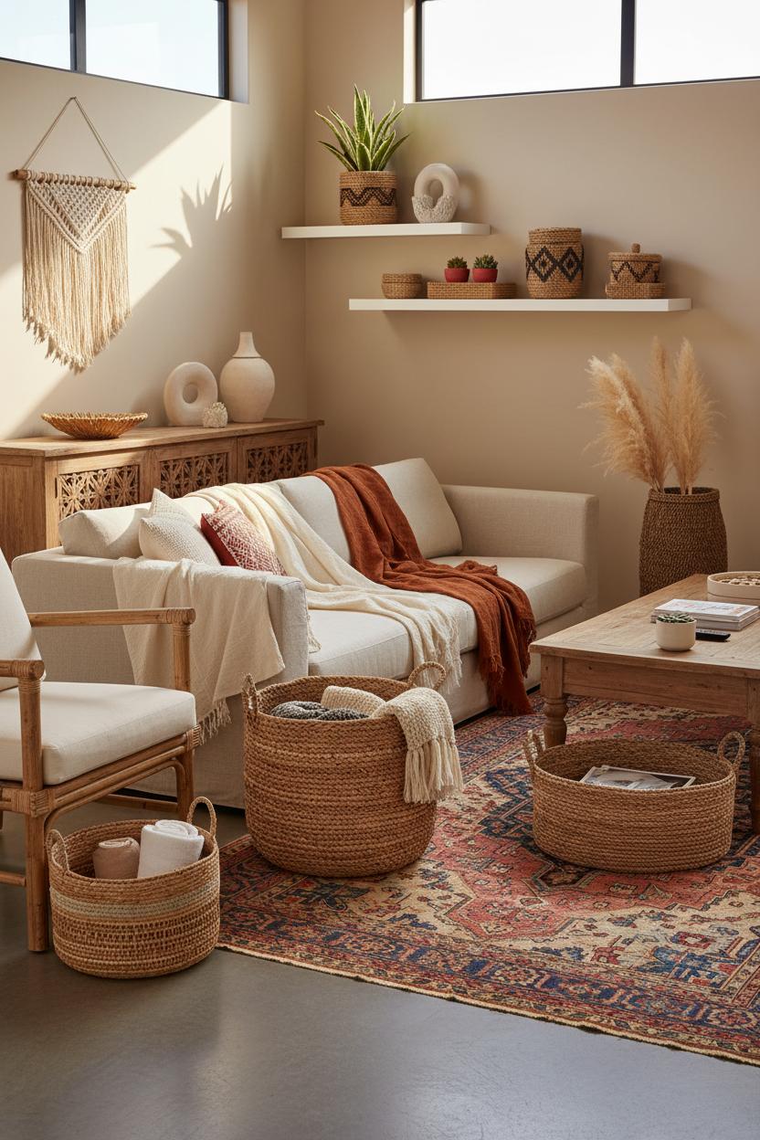 In a boho bedroom, baskets make nightly resets feel dreamy: one for extra pillows, another for linen throws, a petite one for skincare by the rattan accent chair where you sip tea before bed. By the door, a sturdy round basket swallows scarves and dog leashes; in the bath, a tall handled one turns rolled towels into spa-level styling. I love setting a vintage persian rug underfoot and letting its intricate pattern mingle with the humble weave of a basket—glam meets grounded. For a quick vignette, nest a tall basket with pampas grass decor beside your sofa, then balance the height with a low, wide basket full of favorite magazines. The trick is mixing shapes and scales, keeping tones warm and cohesive, and letting the woven texture repeat throughout your space so it feels intentional. Woven storage baskets don’t just hide clutter—they create breathing room, inviting that relaxed, collected energy that makes a bohemian style home feel like a gentle exhale.