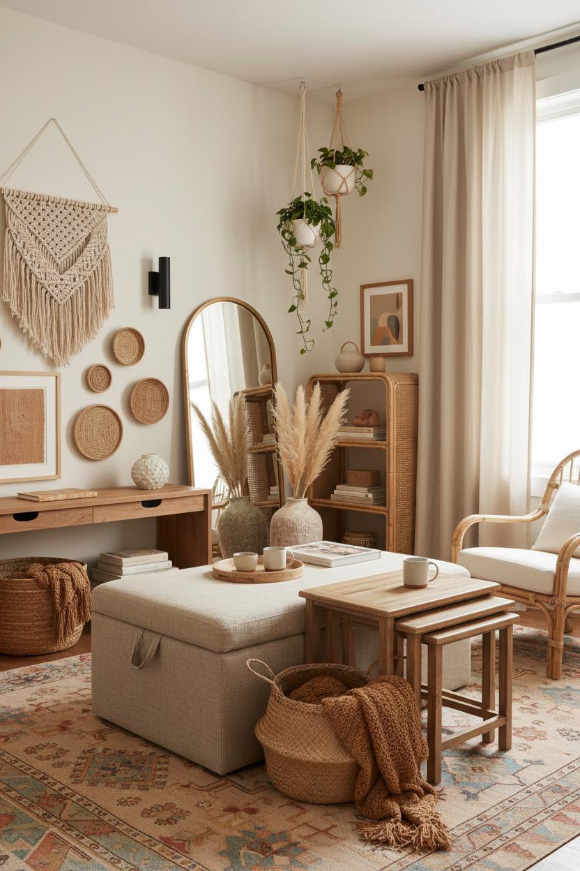 When square footage is scarce, lean into the boheme aesthetic by choosing pieces that do more than one job and by stacking texture vertically so your eye travels up. Start with a compact foundation—think a storage ottoman that moonlights as a coffee table, nesting side tables that slip away when you don’t need them, and a slim rattan accent chair that reads airy rather than bulky. Tuck woven storage baskets under a console or bench for blankets and books, then ground the nook with a vintage persian rug to bring in that sun-faded, collected-over-time feel without overpowering the room. Keep the palette in warm neutrals—sand, oat, camel, clay—so the space breathes, then sprinkle in soft hits of terracotta or ochre for a lived-in glow. A tall vase with pampas grass decor draws the eye up while adding feathery movement; place it near a mirror to bounce light and make your eclectic home feel larger.