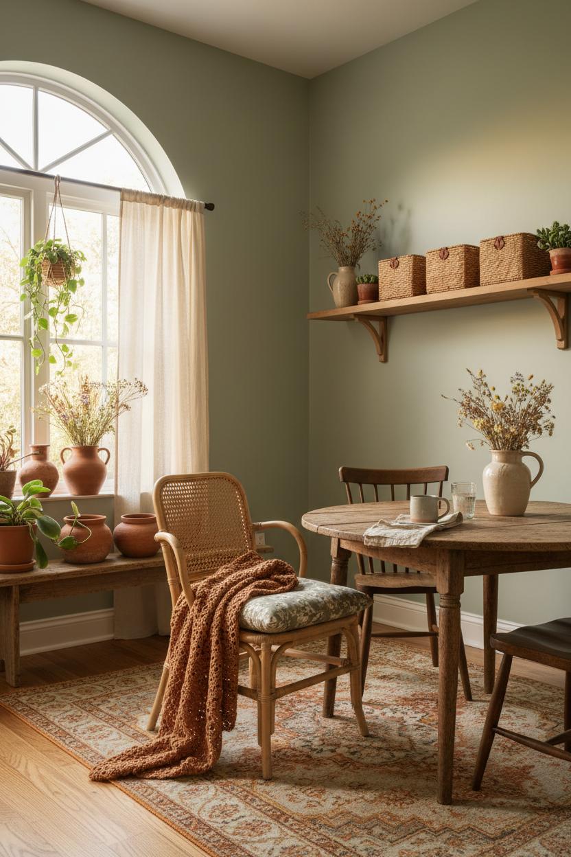 To bring it to life, start with the greens. A soft sage on the walls or cabinetry sets a calm backdrop, especially if you echo it with a botanical print or a set of floral cushion covers on a rattan chair. Let terracotta wander through textiles and accents—a faded vintage rug with sunbaked tones, clay planters, a pitcher that doubles as a vase, even a crochet throw blanket in a warm, earthy hue. Keep the woods honest and mixed: a rustic table paired with a smoother modern shelf, a thrifted stool with a burnished patina, maybe a spindle-back chair for that vintage farmhouse wink. Then layer your rattan and florals—woven baskets, caned details, and a few ditsy prints—to keep the vibe breezy, not busy. A dried flower bouquet on the mantel or bedside nods to meadow days and adds texture that lasts. The magic is in those little mismatches: the hand-thrown mug next to the linen napkin, the timeworn edge of the vintage rug brushing against a glossy pot of trailing green. Together, sage, terracotta, and natural woods are a permission slip to slow down, gather what you love, and let your space feel like it evolved in the gentlest, most beautiful way.