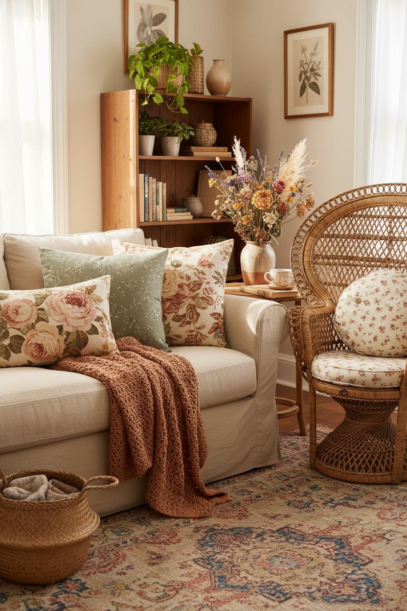 Start by carving out a little pause-in-your-day corner—a spot by a sunny window or beside a bookcase—and anchor it with a rattan chair that instantly sets the mood. Rattan’s honeyed texture is the quiet hero of bohemian cottagecore decor, bringing breezy, organic warmth that pairs beautifully with rattan and florals. Soften the floor with a vintage rug that looks like it’s lived a few lives already, then pile on comfort with a featherlight crochet throw blanket and a couple of plump floral cushion covers. The mix of pattern and texture is what makes boho cottage style feel effortless: a tiny ditsy print next to a chunkier knit, a faded stripe peeking out from a botanical—nothing too matchy, everything charming. Keep the palette grounded in earthy neutrals—oatmeal, clay, sage—with a whisper of dusty rose or cornflower blue so the nook feels calm but layered.