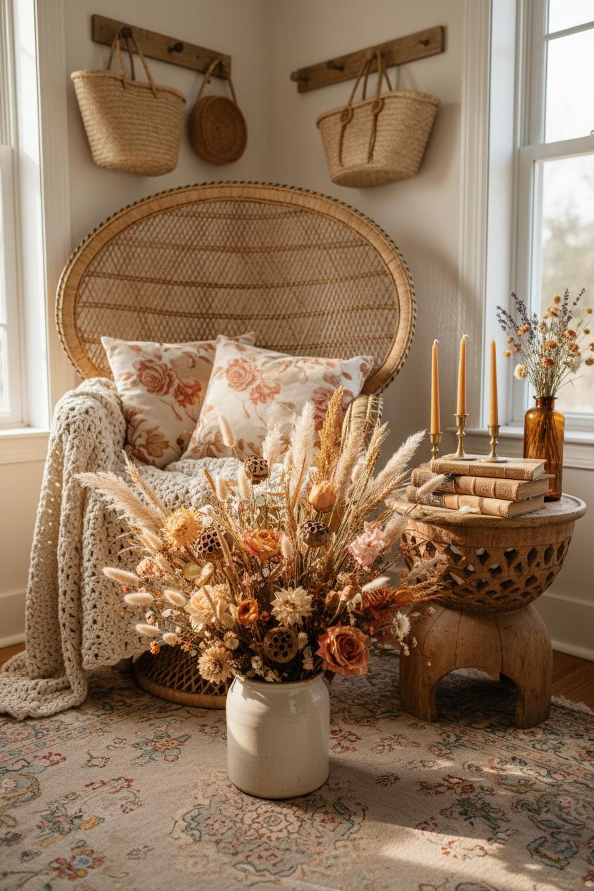 Nothing brings that slow, storybook charm into a room like a dried flower bouquet. It’s the easiest way to tuck a little meadow into your everyday, and it absolutely sings with bohemian cottagecore decor. Think feathery grasses, seed pods, and faded rose heads in sun-warmed tones—oatmeal, blush, rust, and honey—arranged in a simple crock or an amber glass bottle. Because they last, dried stems make low-maintenance magic, letting you layer texture without fuss. Their papery petals and whispery silhouettes invite that dreamy mix of rattan and florals we all love, softening shelves, sideboards, and bedside tables with a hush of nature that feels both nostalgic and calm.