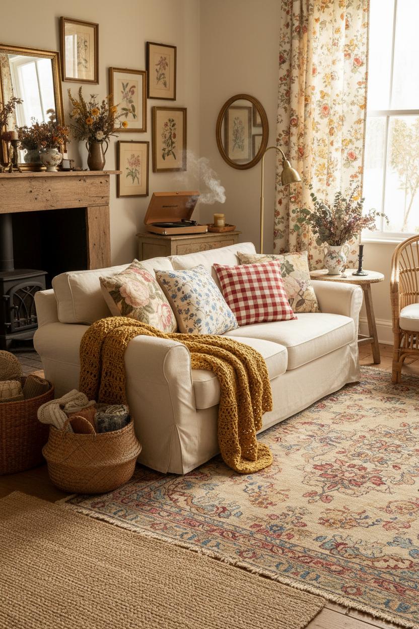 Textiles are your layering MVPs. Roll out a faded vintage rug to anchor the room, then stack on softness: a crochet throw blanket over the arm of your reading chair, plump floral cushion covers sprinkled across the sofa, a linen slipcover grazing the floor. Add a dried flower bouquet on the mantle for that whispery, romantic finish—perfect for anyone collecting cozy home ideas. Keep baskets handy for extra throws and magazines, and weave in small moments of scent and sound: beeswax candles, a gentle record spinning, a kettle steaming on the stove. With each layer, your home becomes a story told in textures and tones—comforting, personal, and beautifully undone.
