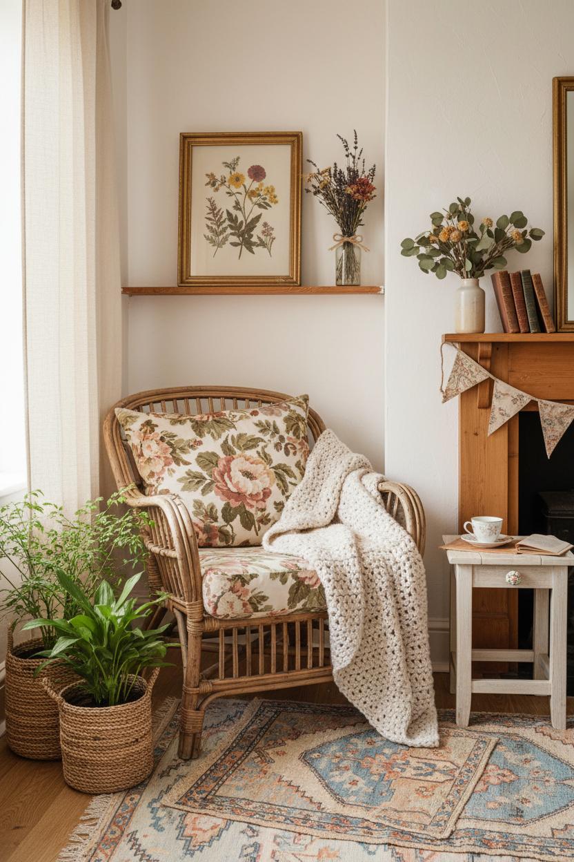 To fold in a touch of vintage farmhouse nostalgia, add a petite side table—think chipped paint, turned legs—and top it with a steaming mug, a well-loved novel, and a dried flower bouquet that lasts through every season. Soft lighting seals the vibe: a pleated shade lamp for glow, or a strand of fairy lights tucked along a shelf for that hush-at-dusk feeling. If space is tight, tuck a lidded basket under the chair for storing extra pillows or quilts; swap in seasonal covers and throws when you crave a refresh. The beauty of these cozy home ideas is how adaptable they are—change one textile and the whole corner shifts tone. Let the rattan chair be your constant, then layer and un-layer around it: more cushions on chilly mornings, the crochet throw blanket draped within reach, a new vintage rug when you stumble on a treasure. With rattan and florals leading the way, your little seating nook becomes a daily ritual—part storybook, part sanctuary, and entirely you.