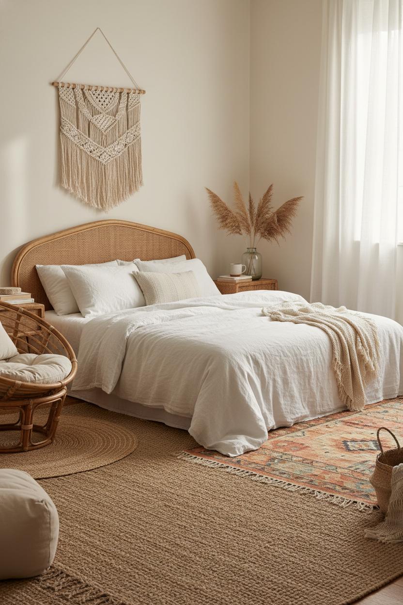 Layer in weight and coziness from lightest to heaviest. Start with crisp sheets, then the linen duvet cover, followed by a lightweight quilt or kantha folded halfway for that casual, collected look. At the foot, add a chunky knit or waffle throw you can grab for cooler nights. Pattern can stay subtle—thin stripes, micro-block prints, or tone-on-tone embroidery—so the bed remains calm but not flat. A macrame wall hanging above the bed echoes the texture story and frames the rattan headboard beautifully, while a vase of pampas grass on the nightstand brings soft movement and that feathered, earthy vibe. Underfoot, a jute rug anchors everything and adds another natural layer that pairs perfectly with breezy linens and woven accents.