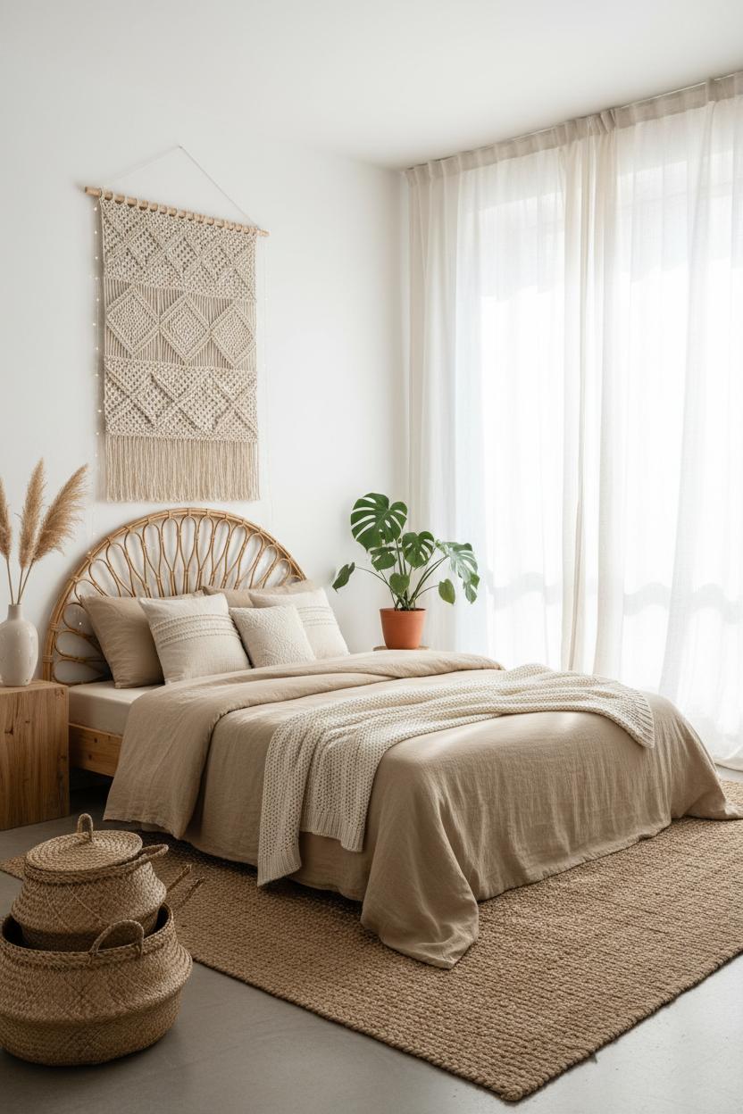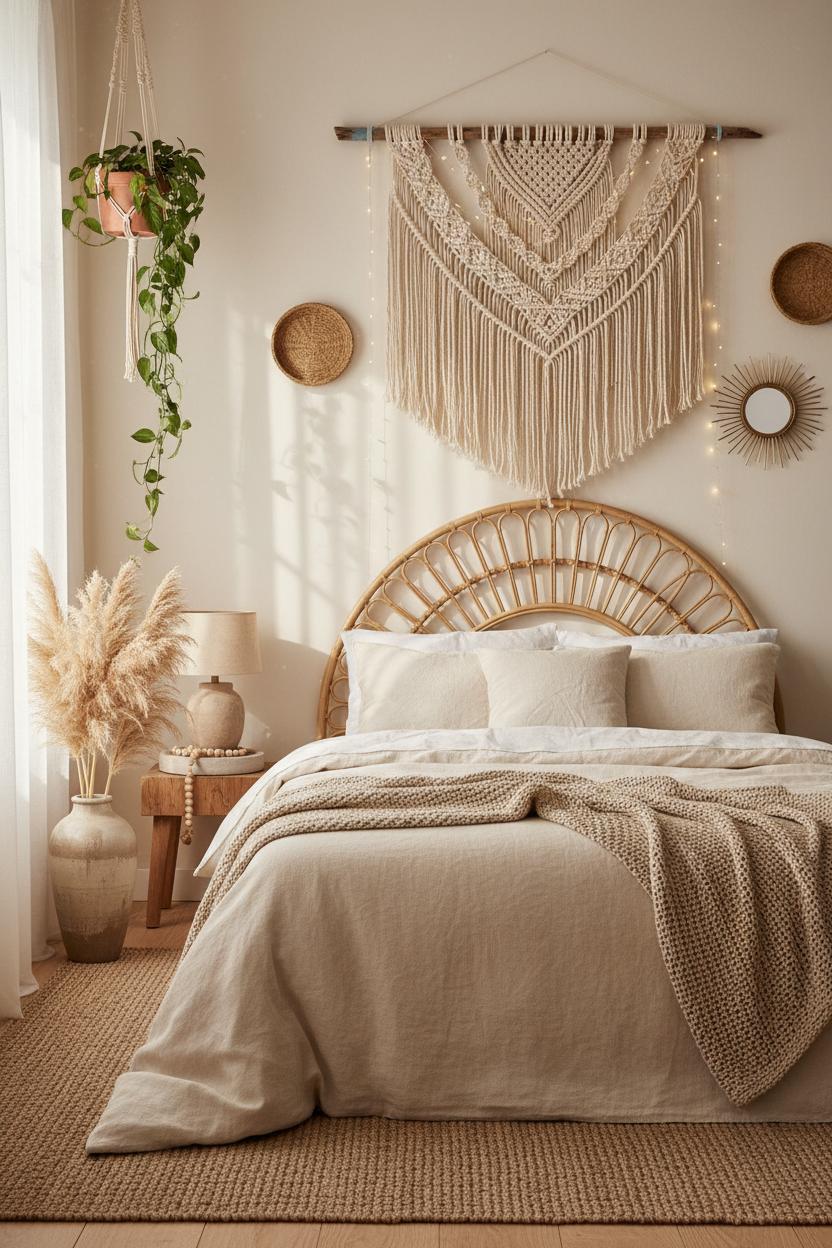 If your heart leans toward calm, light-filled spaces but you still crave texture, lean into a palette of sun-washed whites and earthy tones that feel collected, not sterile. Picture chalky ivory walls layered with oat, sand, and soft clay—shades that shift with the light and make every material look intentionally chosen. A curved rattan headboard anchors the bed with a gentle, organic silhouette, while a chunky jute rug adds that nubby underfoot texture boho bedroom decor is known for. Keep the art tactile: a macrame wall hanging softens hard lines and introduces movement, and a simple vase of pampas grass whispers height and softness without stealing the show. The result is a neutral scheme that still feels interesting, a little beachy, a little desert, and totally livable.