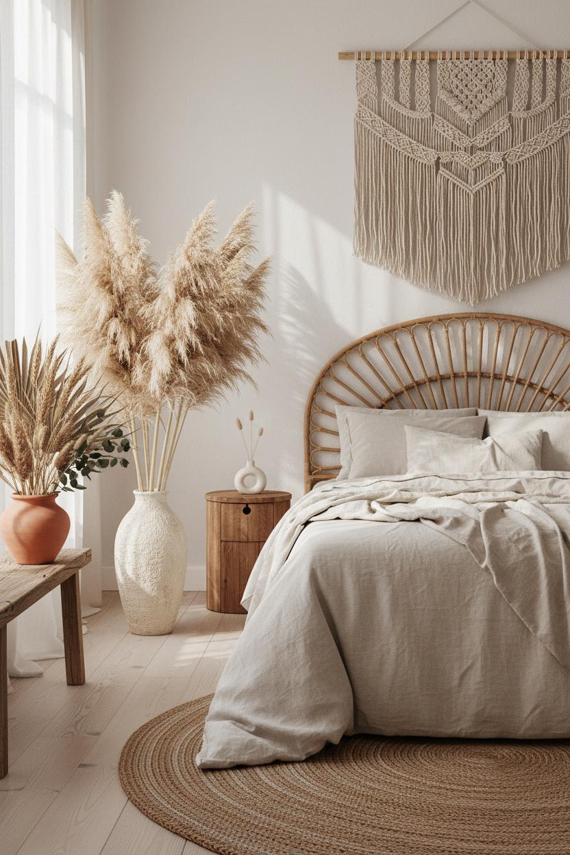 Start with scale to keep the look balanced. A tall floor vase of pampas grass by the rattan headboard frames the bed beautifully, while a single stem in a ceramic bud vase on the nightstand keeps things simple and chic. Layer textures and tones the way you’d style textiles: mix fluffy pampas with reed-like grasses or a fan of dried palm for shape. If you’re leaning into neutral bedroom ideas, choose hues like oat, wheat, and soft ivory, then echo them through a chunky jute rug and the easy drape of a linen duvet cover. Group stems in odd numbers, vary the heights slightly, and let negative space do some of the talking—air around the arrangement is what makes it feel light and intentional, not crowded.