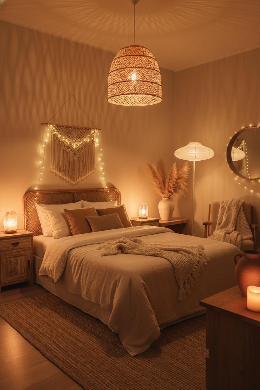 Think of lighting as the soft-focus filter for your boho bedroom decor—everything looks cozier, dreamier, and decidedly more inviting when the glow is warm and layered. Start with a low, mellow base: a rattan pendant or woven table lamp throws those pretty basketweave shadows across the wall, especially magical behind a rattan headboard where the texture really shows. Add twinkle with a strand of fairy lights tucked along a shelf or draped over a macrame wall hanging; it feels like golden hour, on command. A pair of small, warm-white bedside lamps on dimmers lets you dial the mood from reading nook to wind-down whisper, while a salt lamp or flameless candles create that gentle, amber hush. Keep the palette soft and sandy—oatmeal paint, clay pottery, and a creamy linen duvet cover—so the light can pool and bounce without glare. The hush of a jute rug underfoot and feathery plumes of pampas grass in a ceramic vase catch the glow and add movement, turning a boho chic room into a calm, candlelit retreat.