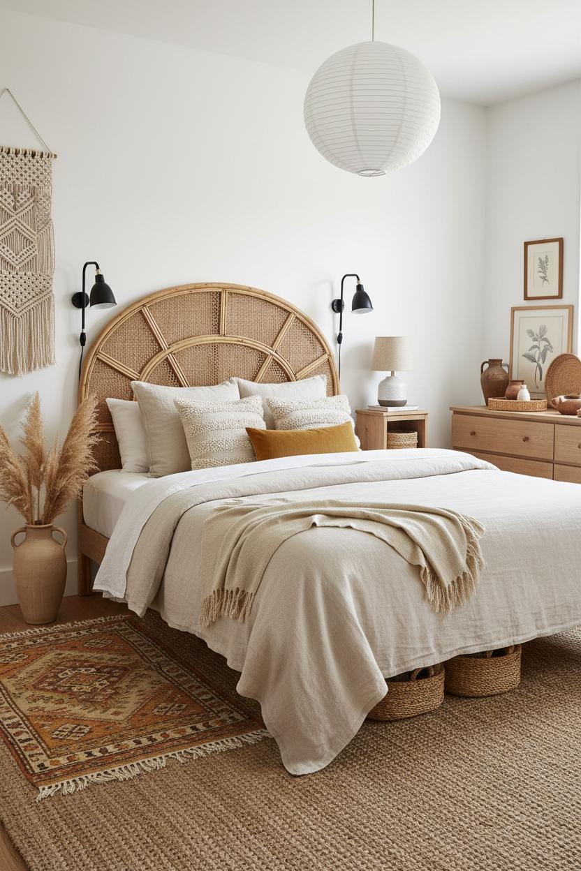 Round it out with approachable lighting and collected accents. Instead of a designer rattan pendant, float a large paper lantern for that diffused glow that makes every boho chic room feel serene; add plug-in sconces to frame the bed without hardwiring. Mix thrifted ceramics, stacked art, and a few woven trays on the dresser to bring in soul without clutter. If you’ve anchored with a rattan headboard, let the rest stay simple: a linen duvet cover, layered throws, a jute rug underfoot, pampas grass in the corner, and a macrame wall hanging above. The result is a perfectly undone, budget-friendly blend—neutral, textured, and effortlessly cozy.