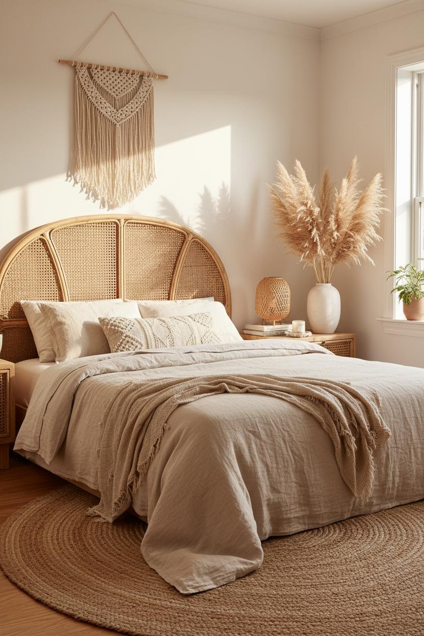 If you’re craving that breezy, layered boho bedroom decor without the splurge, think in “high-low” anchor points. Start with one standout piece that sets the tone—often a rattan headboard—then mix in smart budget swaps around it. A headboard is worth the investment because it immediately delivers texture and shape, but you can also DIY the look with a thrifted bamboo screen or an old wood headboard wrapped in peel-and-stick cane webbing. For nightstands, skip the designer versions and paint basic side tables in a warm, sandy tone; stack a few woven baskets underneath for bonus storage and softness. Keep your palette calm and light—neutral bedroom ideas let textures do the talking—so even simple pieces feel elevated through contrast and layering.