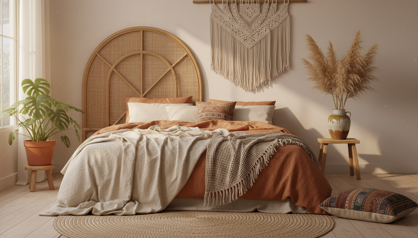 When the seasons shift, let your boho bedroom decor shift with them—think of your space like a mood board you get to refresh every few months. In summer, keep everything light and airy: a breathable linen duvet cover in sand or oat, gauzy curtains that catch the breeze, and a pared-back palette that leans into neutral bedroom ideas without feeling flat. A rattan headboard sets an instant boho chic room tone—its woven texture brings that sun-washed, vacation energy even on weekdays. Layer in a jute rug underfoot for an organic foundation, then keep your surfaces simple: a macrame wall hanging for soft movement, a few stems of pampas grass in a ceramic vase, and woven baskets that swallow clutter so the whole room feels calm and effortless.
