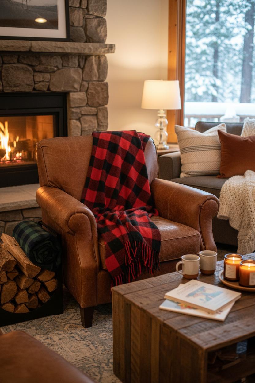 When the temperature drops and the pines start whispering, nothing pulls a room together like a plaid wool throw. In the living room, drape it over the arm of a worn leather chair so it looks ready for story time by the fire. If you’ve got a firewood rack tucked by the hearth, roll the throw and lean it nearby for that “grab-and-snuggle” vibe. Layer it across the back of a sofa, then scatter a couple of textured pillows for instant cabin decor that feels lived-in, not staged. Light a few soy candles to let the glow and scent do their magic—suddenly the whole space reads cozy weekend, even on a Tuesday.