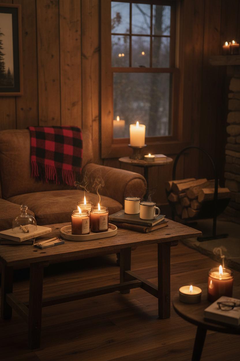 I love creating little scent moments around the room. A trio of amber jars on a tray near the sofa, a single frosted pillar by the window to catch the reflection, a tiny tin by the bedside for wind-down reading. Style them with what you already love: drape a plaid wool throw over the arm of the chair, set out enamel camp mugs for late-night cocoa, and tuck a sturdy firewood rack by the hearth to echo those smoky notes. Morning ritual? Pull an extra sweater, brew a few shots with a portable espresso maker, and let the steam mingle with whatever candle still hums from last night. It turns a simple cozy weekend into a full-sensory experience—warm, fragrant, and delightfully slow.