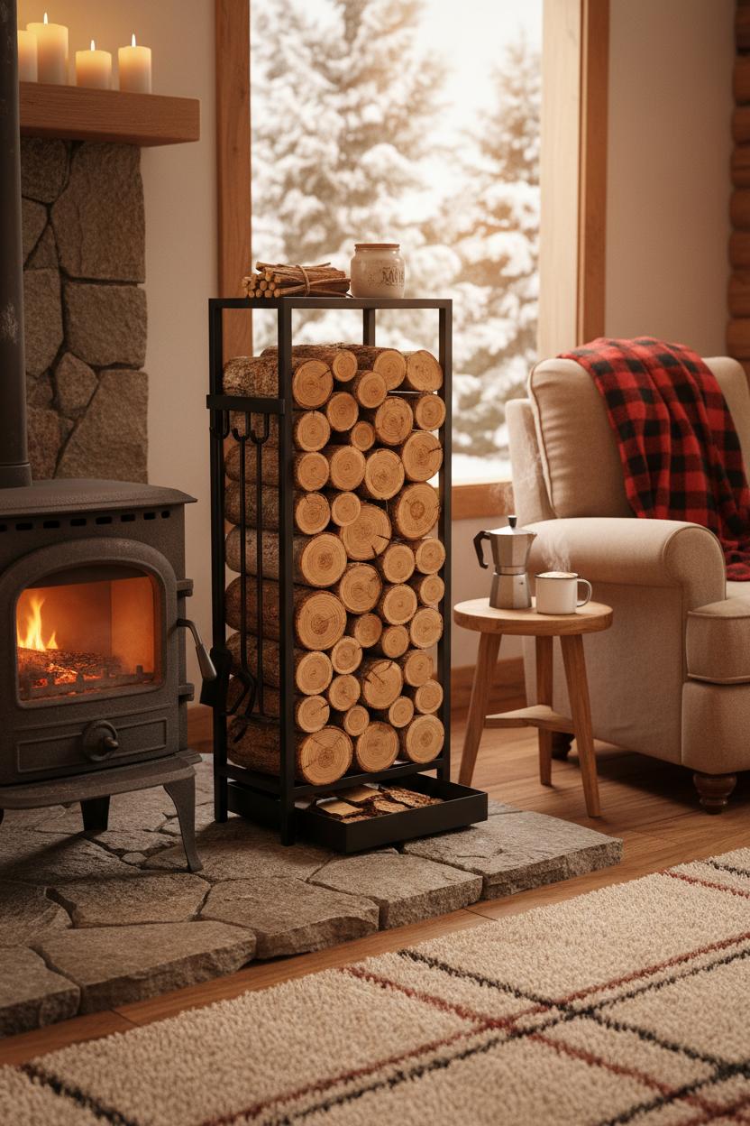 Styling the scene is half the magic. Stack logs with the cut ends facing out—those rings are nature’s graphic print—and nestle a small basket for twigs and pinecones. Drape a plaid wool throw over the arm of a chair, set out enamel camp mugs on a wooden tray, and let soy candles glow on the mantel for that amber, woodsy haze that makes a fall getaway feel endless. If mornings are your moment, keep a portable espresso maker nearby so the first flames greet a creamy cappuccino while snow dusts the pines outside. For outdoor storage, a covered rack keeps cords dry and critter-free; bring in only what you’ll burn in a day to reduce mess and maintain that clean, calm energy. Whether your space skews modern alpine or vintage lodge, the right firewood rack is the quiet hero—tidy, tactile, and ready to gather everyone around. It’s practical warmth dressed up as decor, the final touch that ties your rustic retreat together and turns a simple evening by the flames into a whole-body exhale.