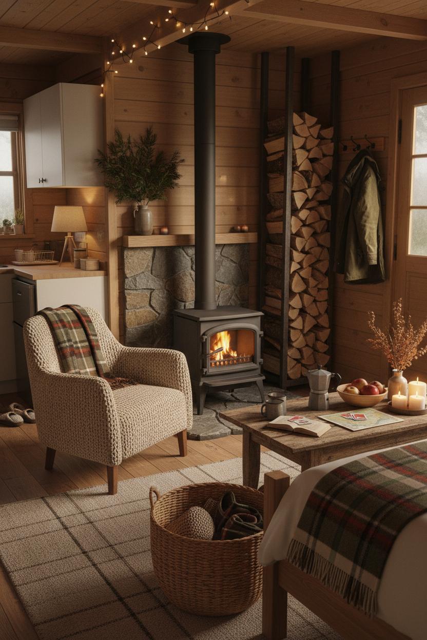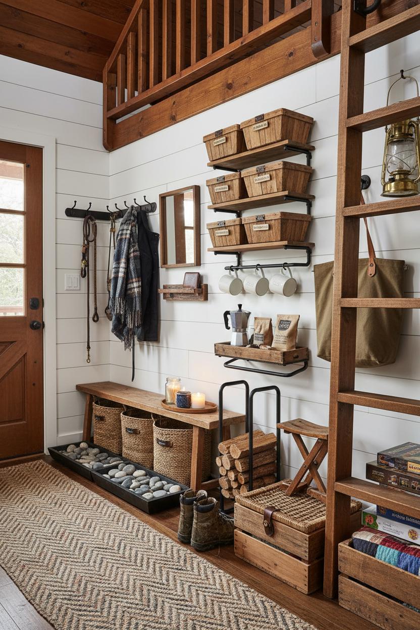 Think of the path from the front door to the loft ladder as your little choreography of comfort—everything you need within arm’s reach, and nothing extra underfoot. Start with a slim bench that hides more than it shows: slide woven baskets underneath for hats, scarves, and wool socks, then hang a simple peg rail above for coats, dog leads, and a plaid wool throw you can snatch on your way to the porch. A shallow boot tray filled with smooth river stones drains melt and mud while looking like intentional cabin decor. If you’re making a fall getaway of it, set a tiny landing zone on the bench—an enamel camp mug corralling keys, a jar of matches, and a couple of soy candles ready to light the dusk with that hygge style glow. Keep a narrow firewood rack tucked beside the door so kindling never sprawls; a canvas log carrier hung on a hook keeps splinters off sweaters and makes refills a one-trip thing.