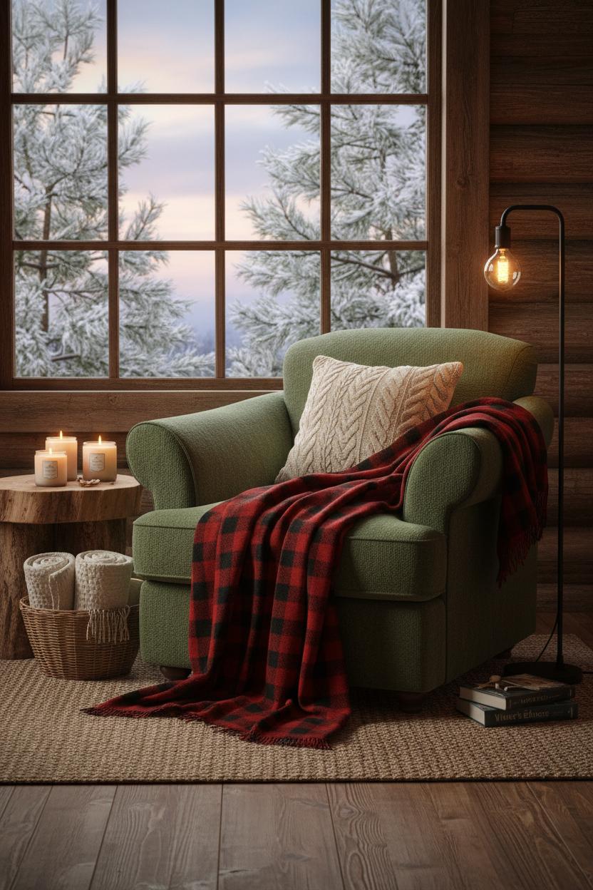 Let your reading nook feel like the heart of your rustic retreat, a little sanctuary where time slows and pages turn themselves. Start with a chair that hugs you back, tuck it near a window so the pine branches and shifting sky become part of the story, and layer textures like you’re styling a dream—think a plaid wool throw puddled over the arm, a chunky knit cushion, and the soft flicker of soy candles on a stump side table. In true hygge style, it’s all about warmth and invitation: baskets for extra blankets, a low lamp with a warm bulb, a small stack of favorites waiting for a quiet afternoon. It’s simple cabin decor done thoughtfully, the kind that turns a cozy weekend into a ritual you’ll crave.