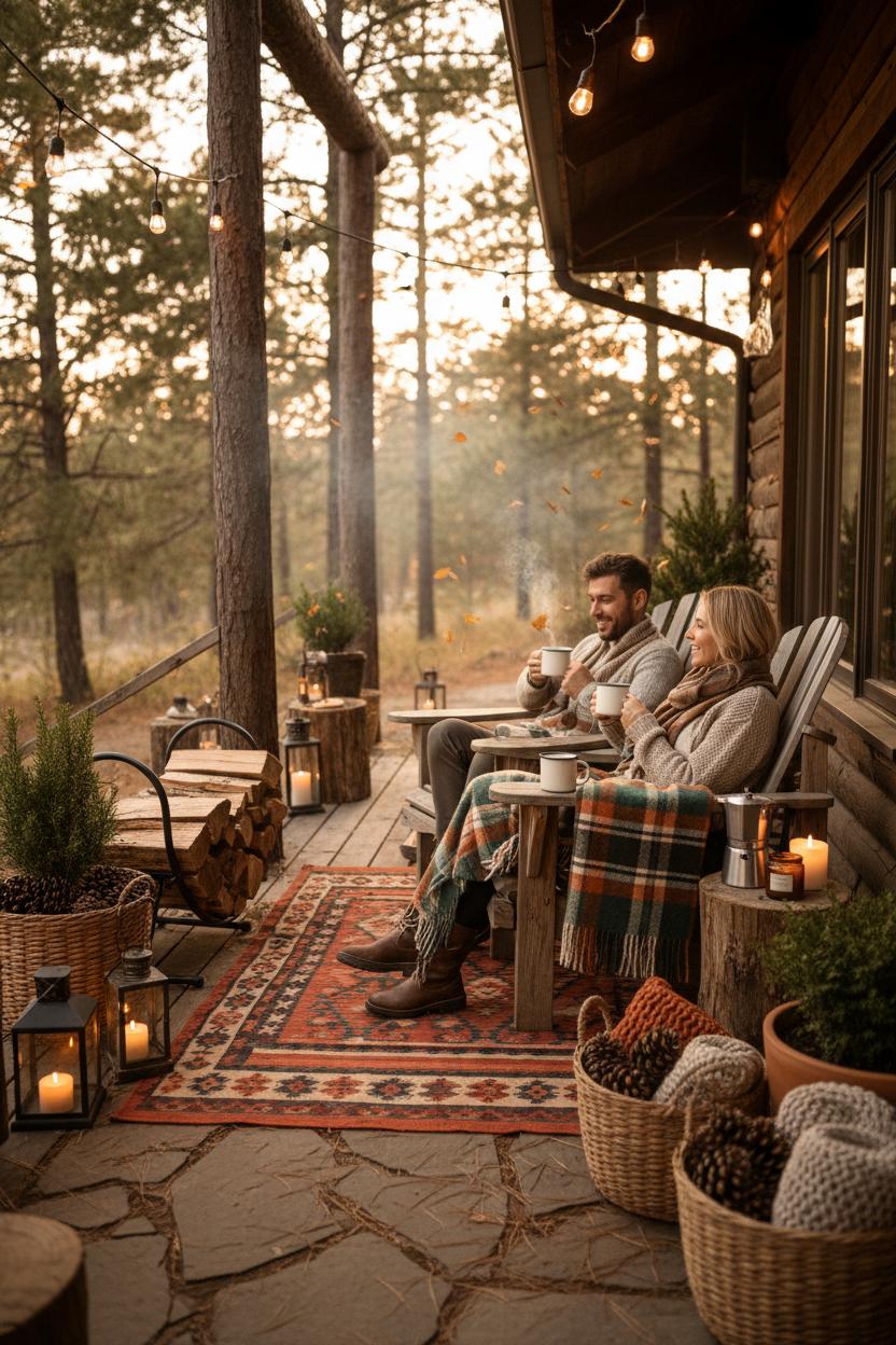 Morning is for watching the mist lift off the trees, wrapped tight in that plaid wool throw while you pull a rich shot with a portable espresso maker and pour it straight into enamel camp mugs—no fuss, all reward. Stack a neat pile of logs in a sturdy firewood rack by the steps so the crackle is always just an arm’s reach away, and let the porch blur into the patio with a mix of woven baskets, evergreen planters, and a few soft cushions that can handle the chill. As the day fades, gather again under string lights, passing around mugs and stories while the last leaves drift down. Be generous with the comforts—double up the blankets, top off the drinks, relight those soy candles—and you’ve captured the essence of a fall getaway without ever leaving your front steps. When the details are thoughtful and tactile, your outdoor nook becomes the coziest page in your weekend story, proof that the best cabin decor isn’t just what you see, it’s how it makes you feel.