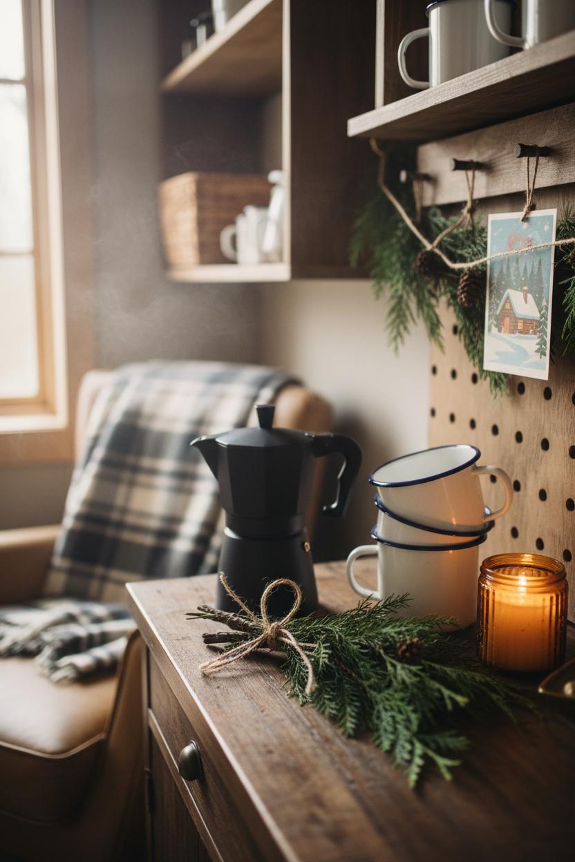 There’s something magical about the way a few evergreen sprigs and a spool of twine can transform a room into a warm, woodsy hug. Snip a handful of spruce or cedar and tuck them behind framed art, slip a sprig into a napkin ring, or tie them with twine to place cards for that effortless, gathered-from-the-forest look. Thread a simple garland by knotting sprigs onto twine, adding a pinecone here and there, and drape it over a mirror or along open shelving. A couple of glass jars become instant mood-makers with water, clipped greens, and unscented tealights, while soy candles in amber jars add a soft glow and cozy scent. For the coffee corner, let a portable espresso maker sit beside a little bundle of green tied with twine and a stack of enamel camp mugs—tiny cabin decor moments that feel very hygge style without trying too hard. Hang a mini wreath on a peg rail, loop twine around a basket handle, and suddenly your rustic retreat feels layered and lived-in.