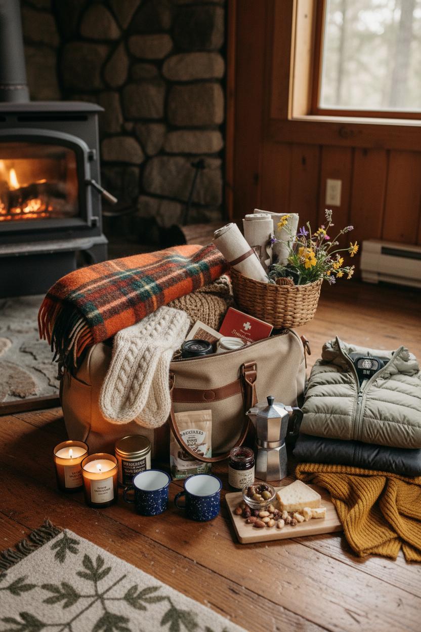 Finally, prep for comfort-meets-practical. Pack a compact first-aid kit, headlamp, and a charger bank, plus slippers you won’t mind wearing to the porch at sunrise. Check the forecast and plan an outerwear trio—light puffer, rain shell, and a scarf—so your cozy weekend stays dreamy even if the weather shifts. For a fall getaway, a small doormat and extra towels help keep leaves and mud at bay, and a reusable tote doubles as a wood carrier or market bag. Think simple, sensorial, and slow—little touches that invite you to exhale, sip something warm, and let your cabin decor, nature’s soundtrack, and an unhurried pace do the rest.