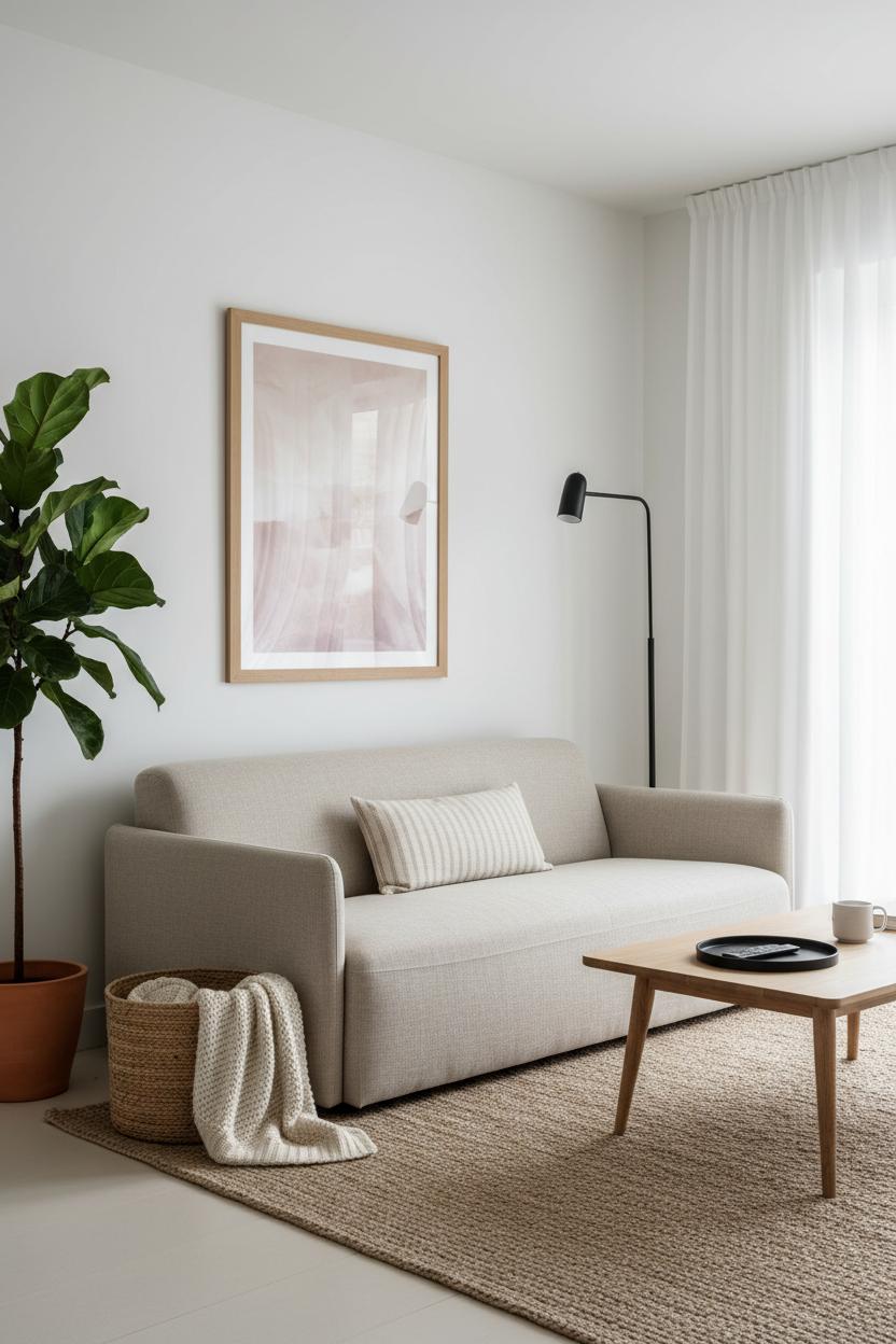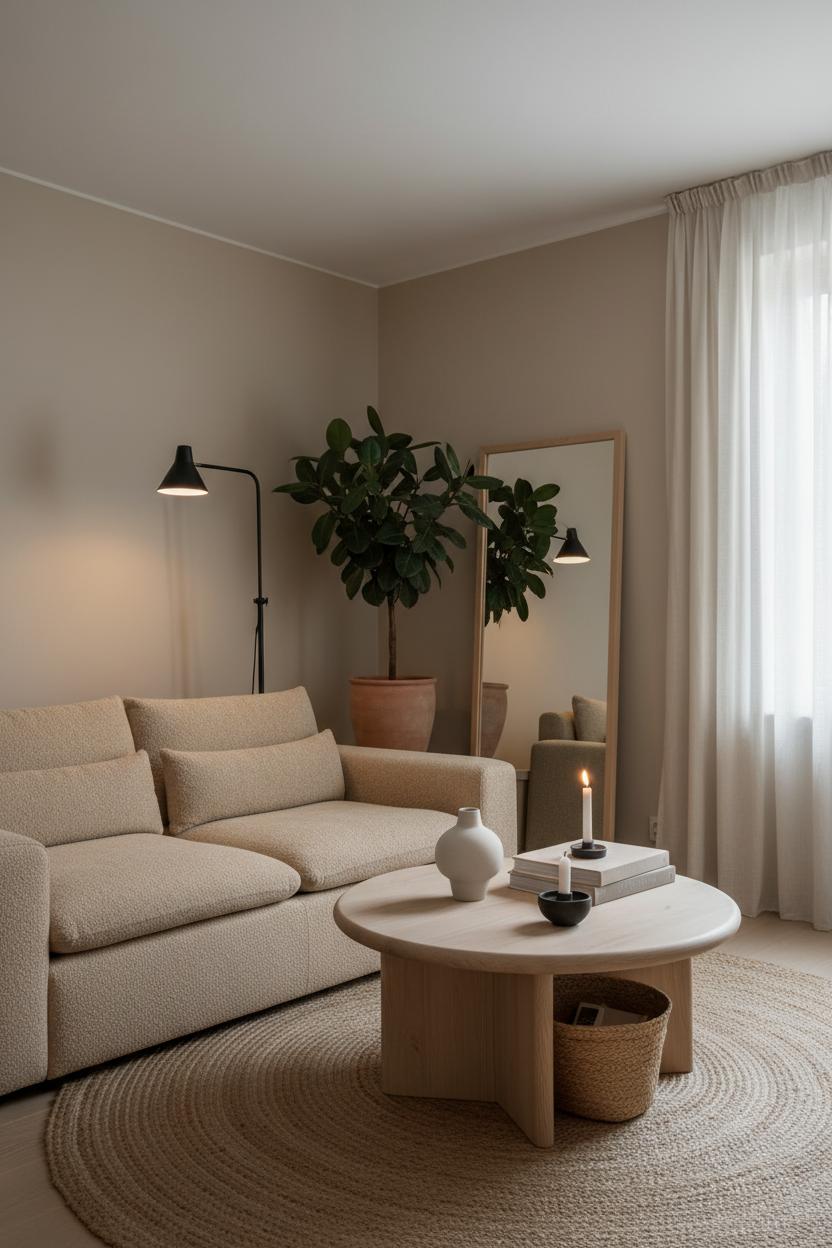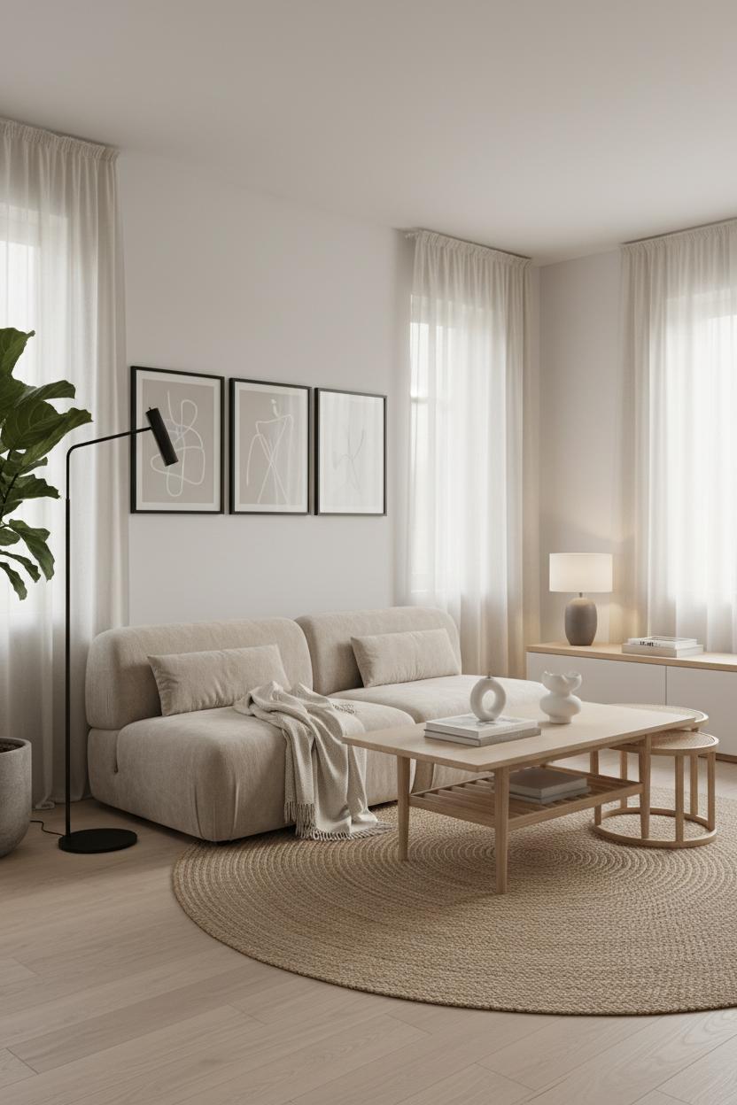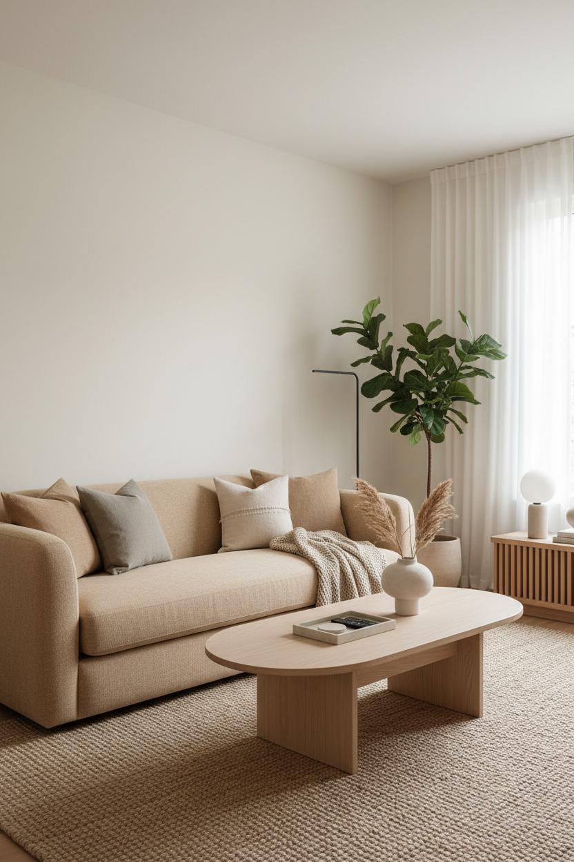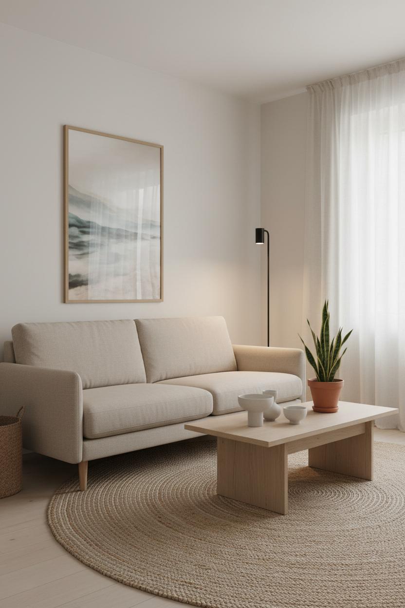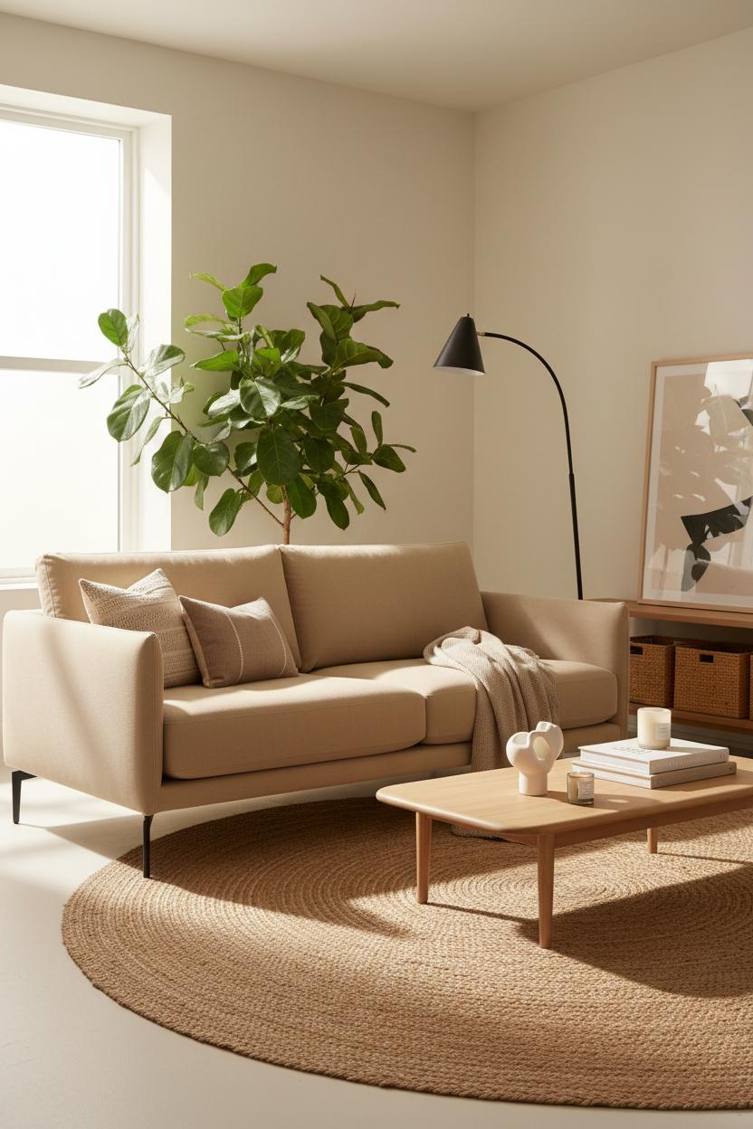 Anchor the room with a comfortable beige sofa that invites lingering without shouting for attention, and ground it with a tactile jute rug underfoot. A light wood coffee table adds warmth and a soft, organic shape—round or oval edges keep the energy flowing and feel extra friendly in tighter layouts. Add a black floor lamp for a hint of contrast and sculptural presence; the silhouette reads modern decor while still being timeless. Bring in one generous indoor plant to breathe life into the corners and soften all those clean lines. Styling should be simple and thoughtful: a single ceramic vase, a few art books, maybe a woven basket to corral remotes. The goal is to have every piece earn its keep while still leaving space for your eyes to rest.