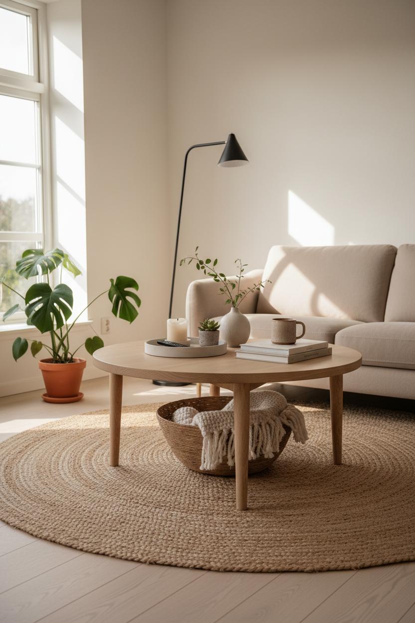 In a calm minimalist living room, a light wood coffee table is the quiet centerpiece that ties everything together without shouting for attention. Its pale grain brings instant warmth and airiness, especially when surrounded by a soft beige sofa and a textured jute rug that adds a grounded, natural layer. Think scandinavian style, but softer: clean lines, gentle curves, and a tone that plays well with a neutral home palette so the space feels open, sunlit, and welcoming. I love adding a slim black floor lamp for a touch of contrast and a sculptural moment, plus an indoor plant to bring life and movement—suddenly the whole vignette feels curated yet effortless, like modern decor with a soul.
