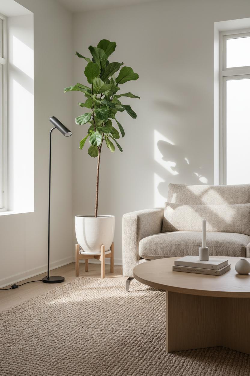 If you’re working with limited square footage, consider these small space tips that keep things serene, not cluttered: go tall and slender rather than wide, so your plant draws the eye upward without stealing floor area. A pedestal or low stool lifts the greenery and gives it presence without bulk. Try a textured planter in stone, chalky ceramic, or a woven basket that quietly mirrors the jute rug beneath your feet. Cluster the plant with a single stack of books and a candle on the coffee table, then leave generous negative space around it so the room feels airy. Repeat wood tones in the planter stand to connect with the coffee table, and let the plant’s green be the only color pop in the palette. With just this simple addition, your living room keeps its minimal, scandinavian style soul—only now it hums with a softer, more organic rhythm.