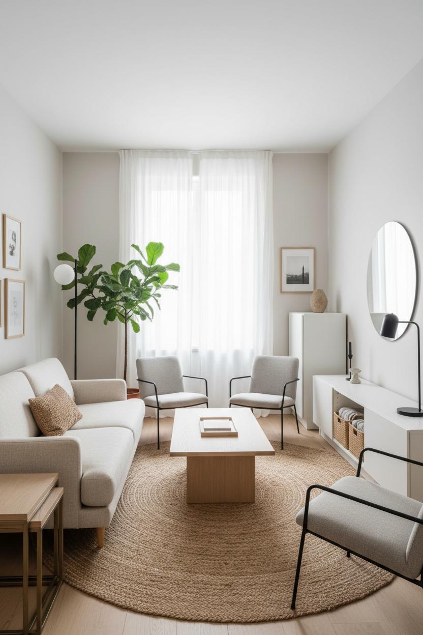 When space is tight, start with the flow. Think of your minimalist living room as a gentle loop rather than a hard stop: pull the beige sofa a few inches off the wall, float a light wood coffee table in front, and let a natural jute rug anchor the zone so pathways feel intuitive. Keep the heaviest piece on one wall and balance it with open, airy elements on the opposite side—slim-leg chairs, a black floor lamp with a slender profile, maybe an indoor plant that draws the eye upward. Arrange seating so conversation happens at arm’s reach and sight lines remain clear from door to window. In small rooms, corners are precious; angle a chair toward the room, tuck a floor lamp behind it, and you’ve instantly created depth without clutter. These small space tips keep circulation easy and the room’s energy calm.
