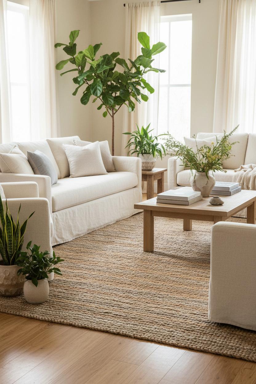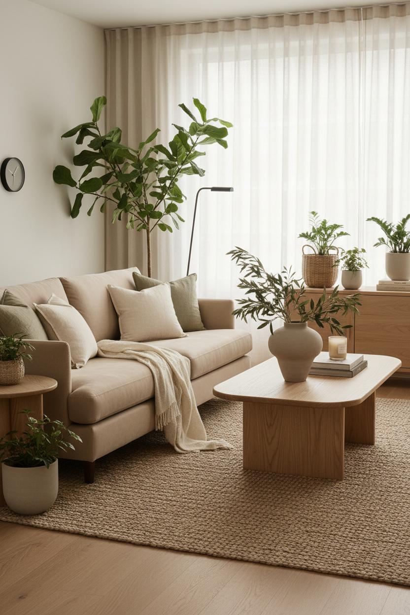 From there, lean into indoor plants styling to soften all those clean lines and make the natural living room feel truly alive. One statement plant is often enough: an indoor fiddle leaf fig in a woven basket adds height, glossy texture, and a gentle arch to the room’s silhouette. Echo its green with a smaller fern or trailing pothos on a shelf, but resist the urge to overfill—air and light are as much part of the design as any object. Sheer linen panels on the windows filter daylight, turning the whole space into a warm glow by afternoon. A few collected pieces—stacked books, a hand-thrown mug, a smooth wood bowl—whisper rather than compete. The result is a neutral living room that feels balanced and grounded: layers of tactile neutrals, honest materials, and simple forms that invite you to exhale. When you keep the foundation quiet and the textures thoughtful, the room naturally evolves with the seasons—swap branches in that ceramic vase, rotate pillow covers, or let a new sprig of green take center stage—and the calm stays constant.