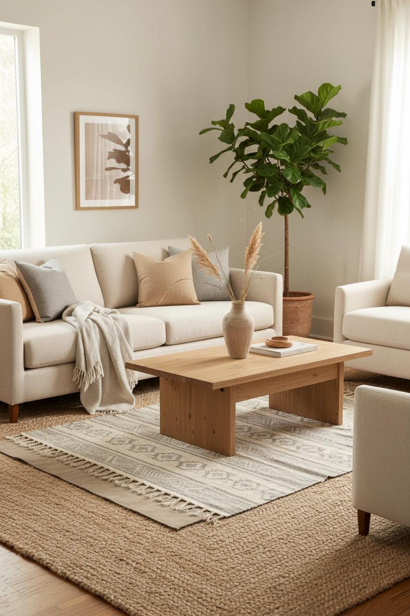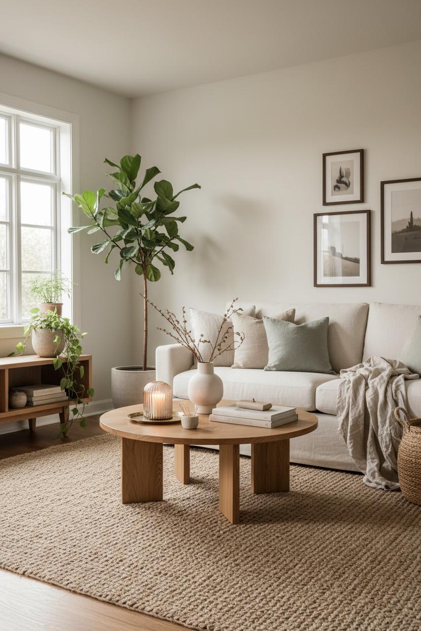 At the center, an oak coffee table with rounded corners feels friendly and timeless, its grain adding quiet movement to the scene. A plush sofa in a warm neutral gets a relaxed upgrade with linen throw pillows in tonal shades—ivory, putty, a hint of olive—so the eye travels without ever getting jarred. Underfoot, a generous jute area rug anchors the seating and ties the wood tones to the upholstery, while the slight variation in weave keeps the look organic. On the table, a weighty ceramic vase filled with clipped branches or seasonal stems becomes sculptural art, flanked by a couple of favorite books and a hand-poured candle. The whole effect is a neutral living room that feels curated but not precious—refined lines softened by touchable materials and everyday rituals.
