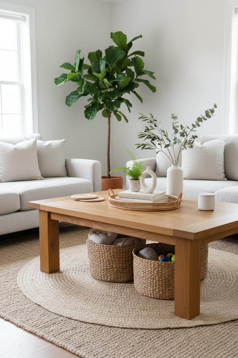 For indoor plants styling, think sculptural and simple. A petite fern or trailing pothos on the tray keeps things low and lush, while an indoor fiddle leaf fig beside the sofa balances the table’s horizontal lines with big, glossy leaves. Vary heights for a collected look—short stack, medium vase, taller greenery—so your eye travels. If life is busy (whose isn’t?), lean on hardworking basics: woven baskets under the oak coffee table for kids’ toys or throws, a wipeable tray for easy crumb control, and a rotating cast of blooms you can swap with the seasons. Keep the color story tone-on-tone—creamy ceramics, pale pages, flax linens—so the wood feels like the star and the room breathes. The result is a living, breathing coffee-table vignette that looks styled for a photo, yet functions for everyday: space for snacks, a perch for your laptop, and a quiet moment for that afternoon tea. Wood, linen, and greenery doing what they do best—creating a calm, grounded rhythm you’ll come back to again and again.