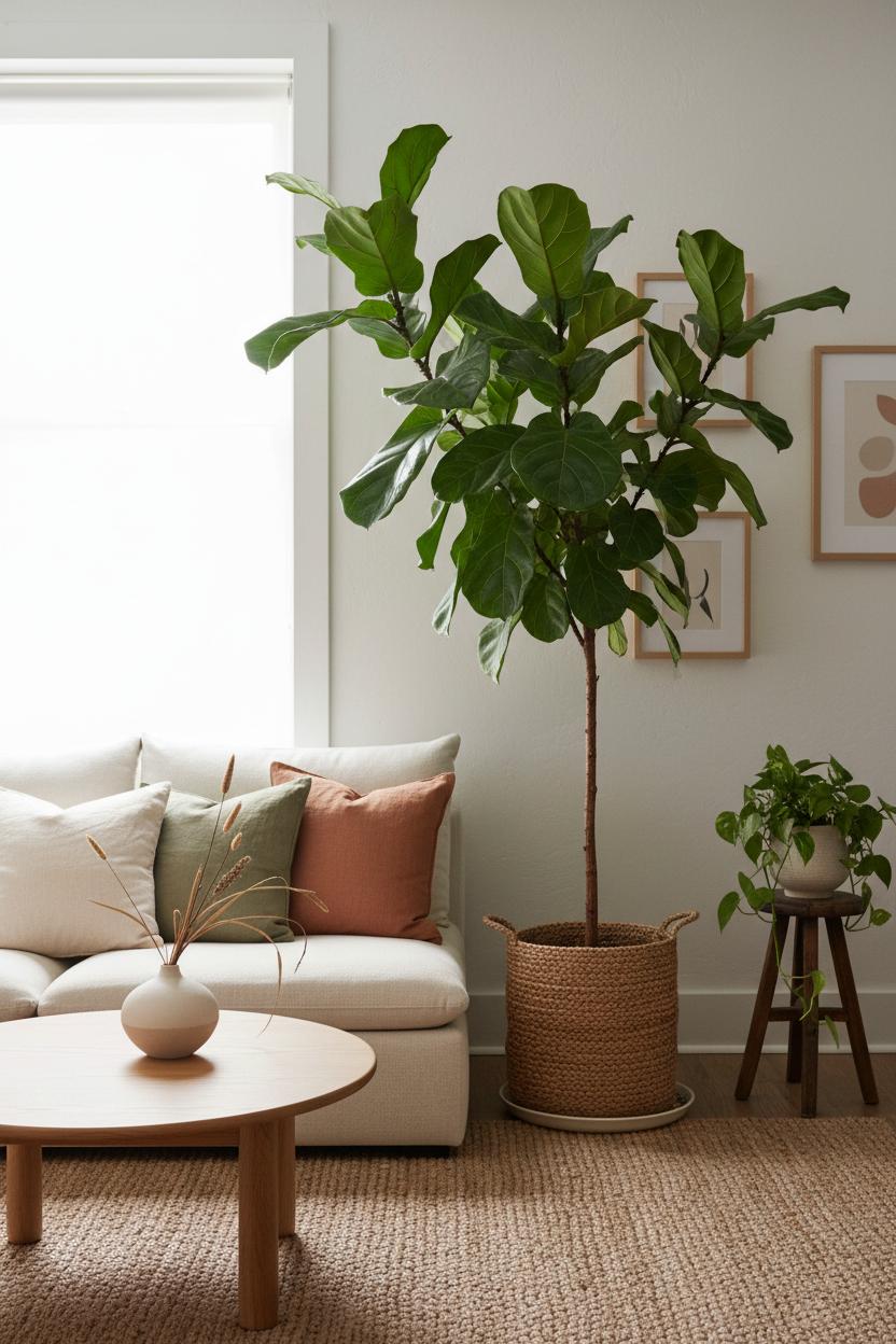 When a room is built on quiet textures and honest materials, a single sculptural plant can become the heartbeat of the space. I love anchoring a natural living room with an indoor fiddle leaf fig—its glossy, violin-shaped leaves bring instant height and a soft, organic silhouette that plays so beautifully with wood and linen. Tuck it beside a window where it can soak up bright, indirect light, and let it rise just above the sightline of your sofa so it feels architectural, not cluttered. For a seamless, organic modern decor moment, slip the nursery pot into a woven basket or a matte ceramic planter, then echo those earthy tones underfoot with a chunky jute rug that grounds the seating area without stealing focus from the greenery. The whole look reads like a neutral living room done right: calm, airy, and quietly alive.